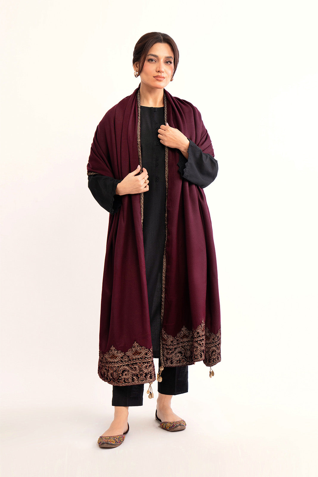 Article Name: SHAMSI S Color: Burgundy Fabric: Semi Pashmeena Pieces: 1 Piece Shawl Dark burgundy semi pashmina wool shawl detailed with velvet emb borders on four sides & golden tissue facing with golden tassels.