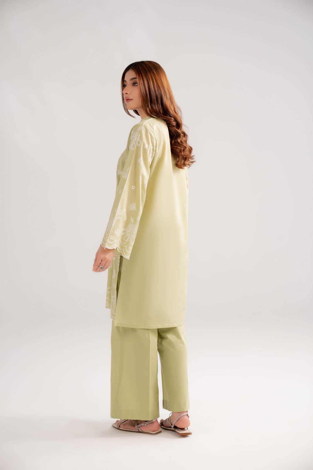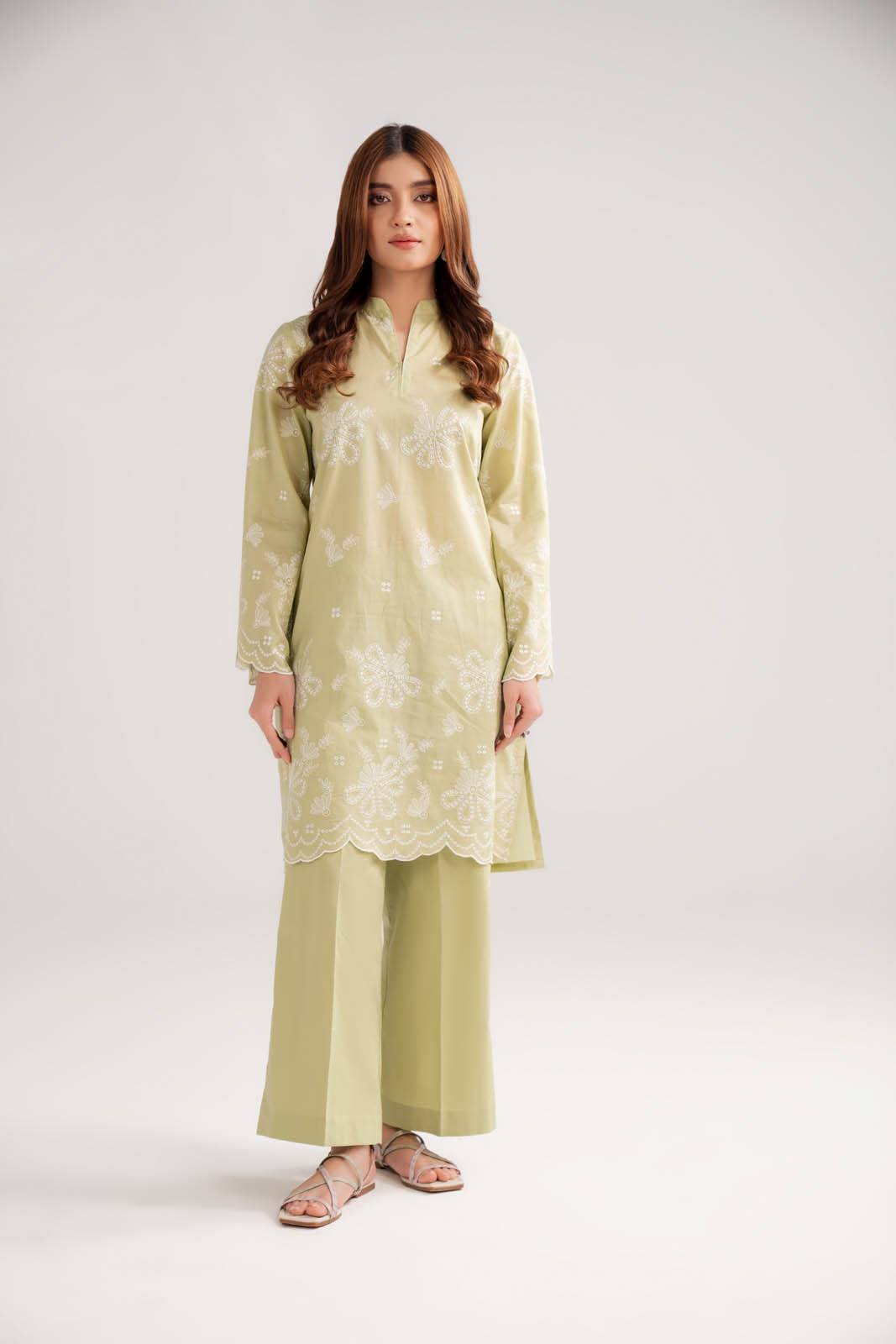 Article Name: MYLA F Color: Light Green Fabric: Lawn Pieces: 2 Piece Shirt/Bottom Light green lawn embroidered 2 pieces detailed with embroidery on shirt & paired with trouser.