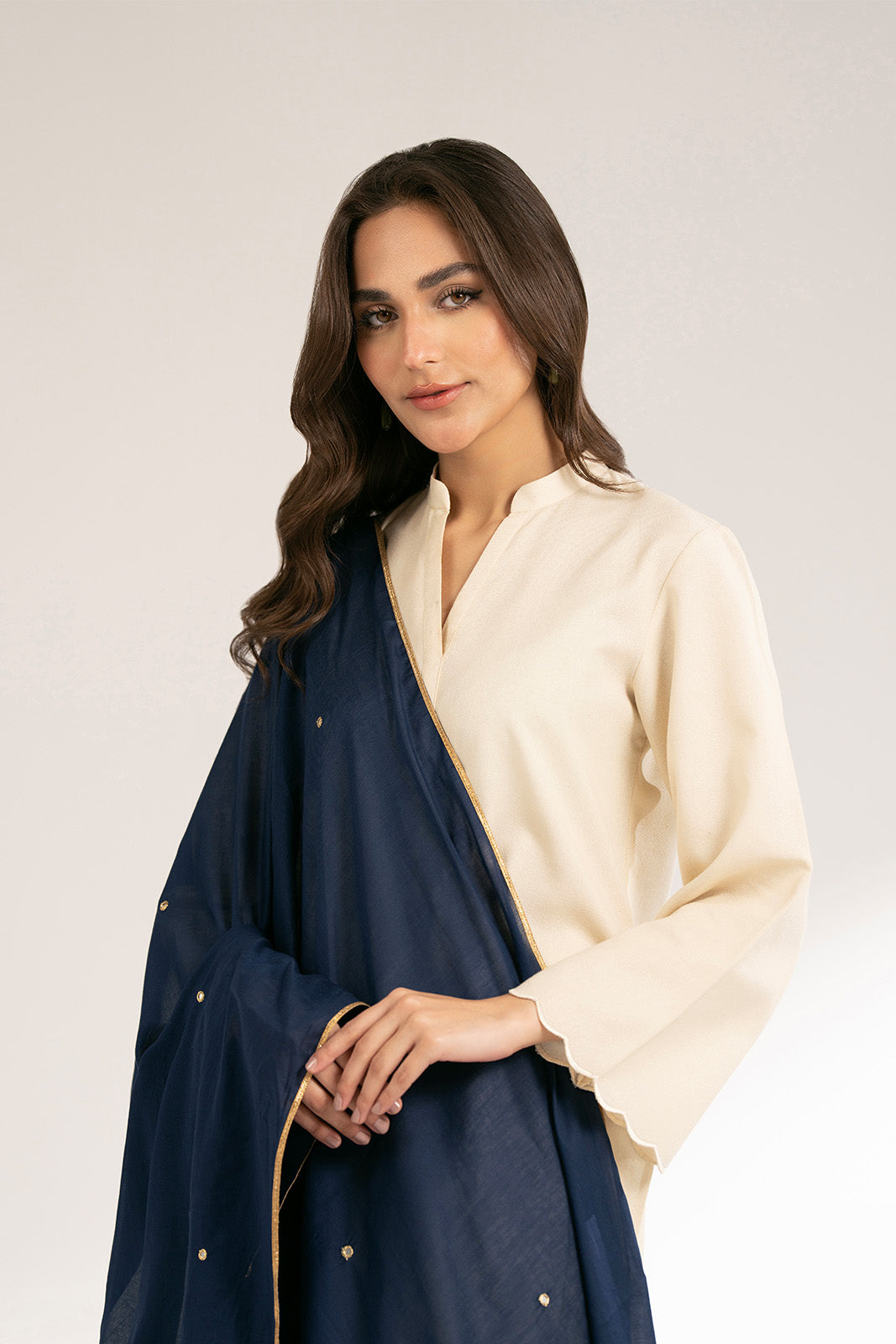 DetailsArticle Name: AINOOR PColor: Off WhiteFabric: Printed LawnPieces: 2 Piece Shirt/BottomOff White lawn printed 2-piece suit detailed with scallop on sleeves & paired with culottes.