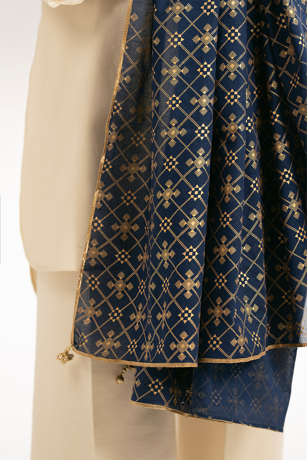 Article Name: NEELAM ST A Color: Navy Blue Fabric: Printed Lawn Pieces: 1 Piece Stole Screen gold printed lawn stole with mirror spray allover and four sides gota edging along with tassel detail on all corners.