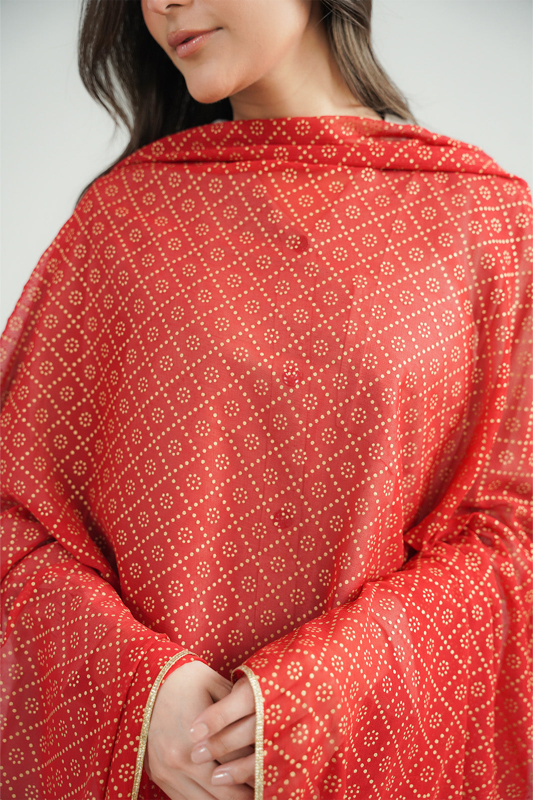 Article Name: FLORAL DOTS ST Color: Red Fabric: Printed Chiffon Pieces: 1 Piece Stole Red gold printed chiffon dupatta with four side gotta edging and coins details.