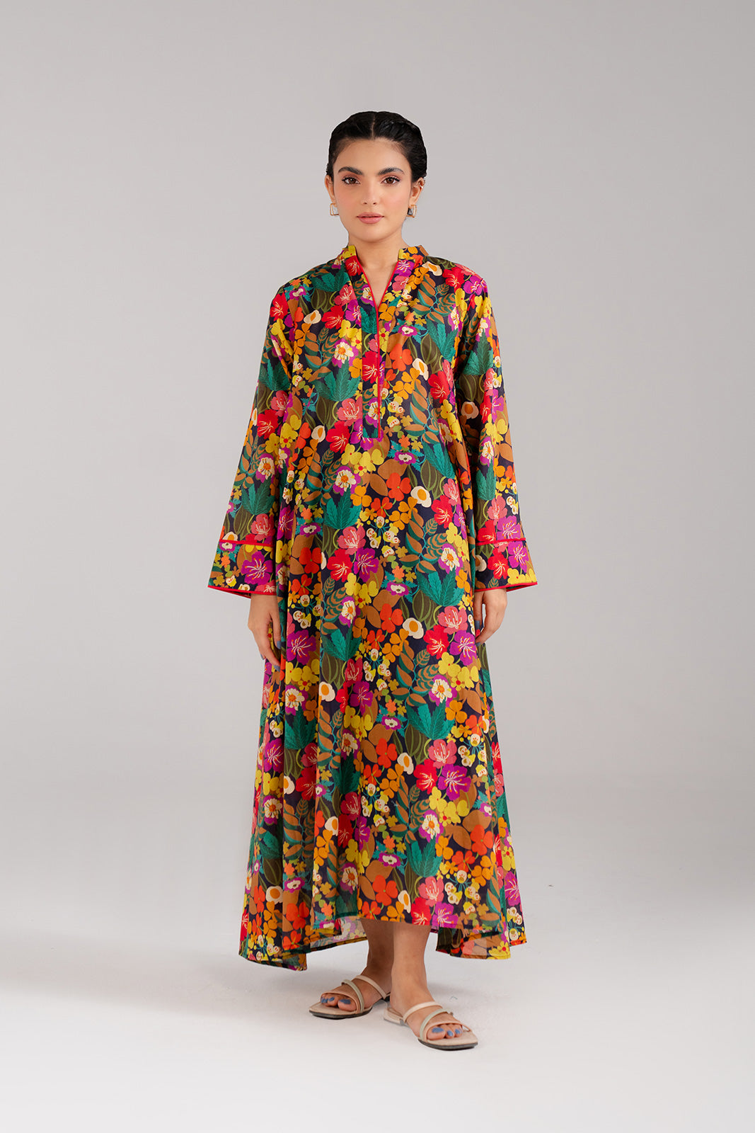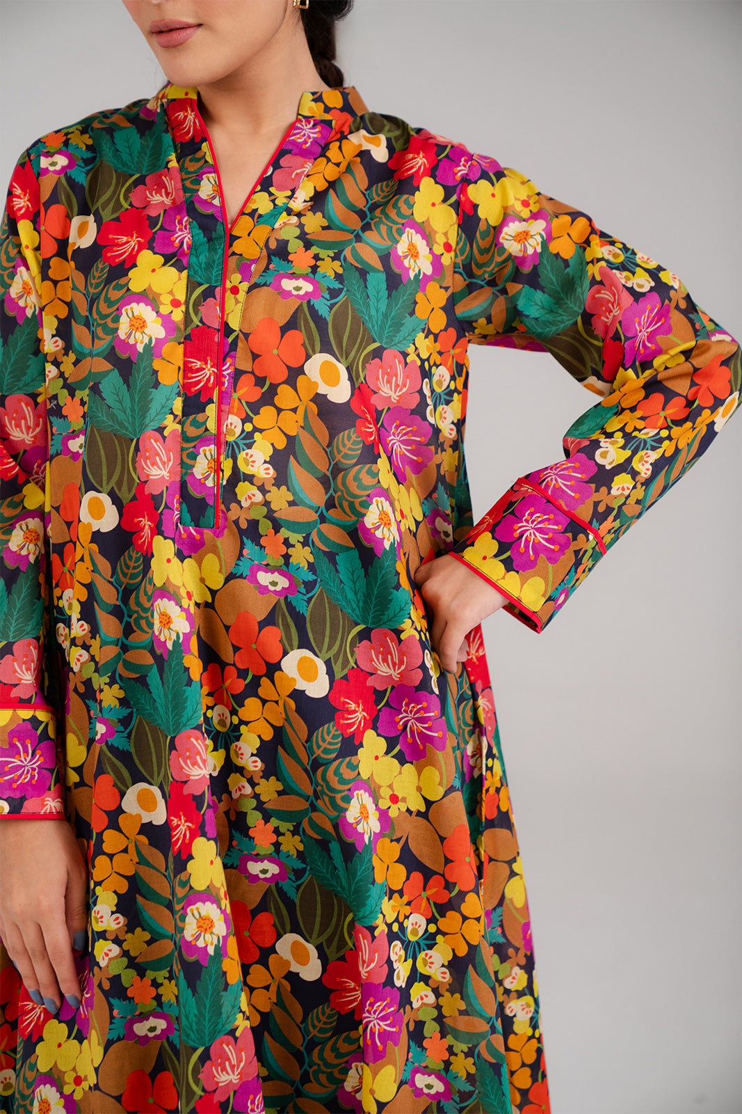 Article Name: BLOOMING P Color: Multi Fabric: Lawn Pieces: 1 Piece Shirt Floral printed shirt with delicate detailing on the neckline and sleeves, finished with binding facing.
