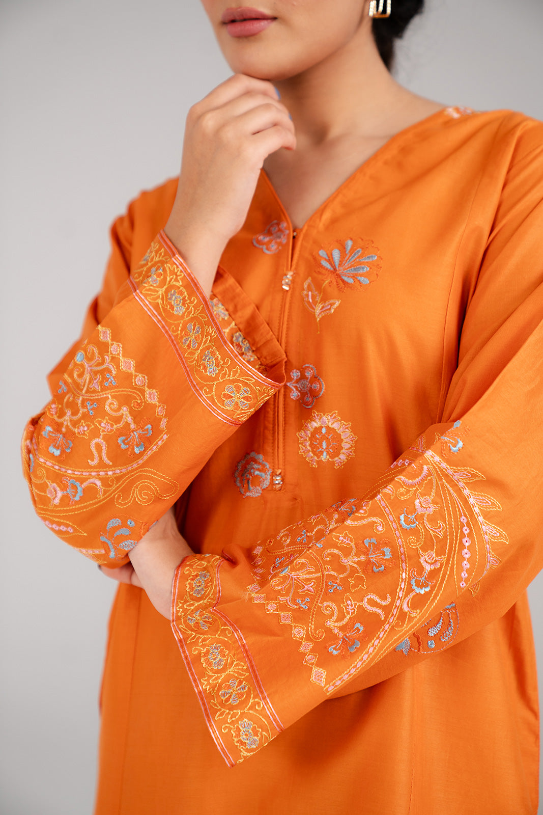 Article Name: ZAYANA Color: Orange Fabric: Lawn Pieces: 1 Piece Shirt Orange embroidered shirt with delicate floral embroidery on the front and sleeves.