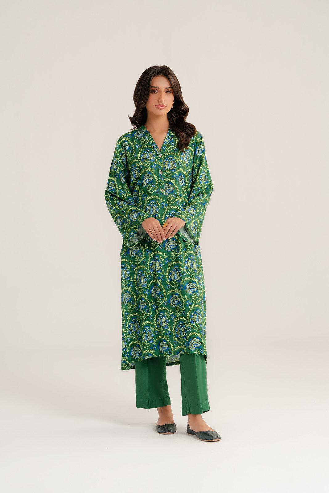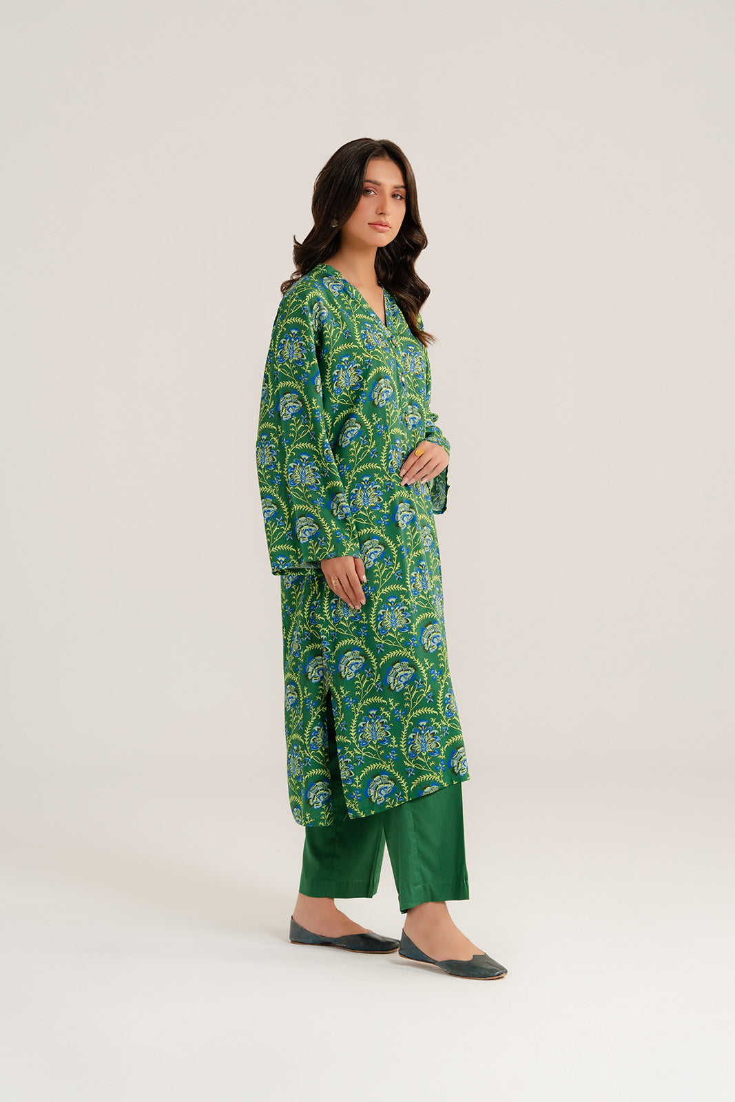Article Name: FRESHMINT P Color: Green Fabric: Linen Printed Pieces: 2 Piece Shirt/Bottom Green linen printed two piece suit detailed with printed shirt with tasseling on neckline and plain trouser.