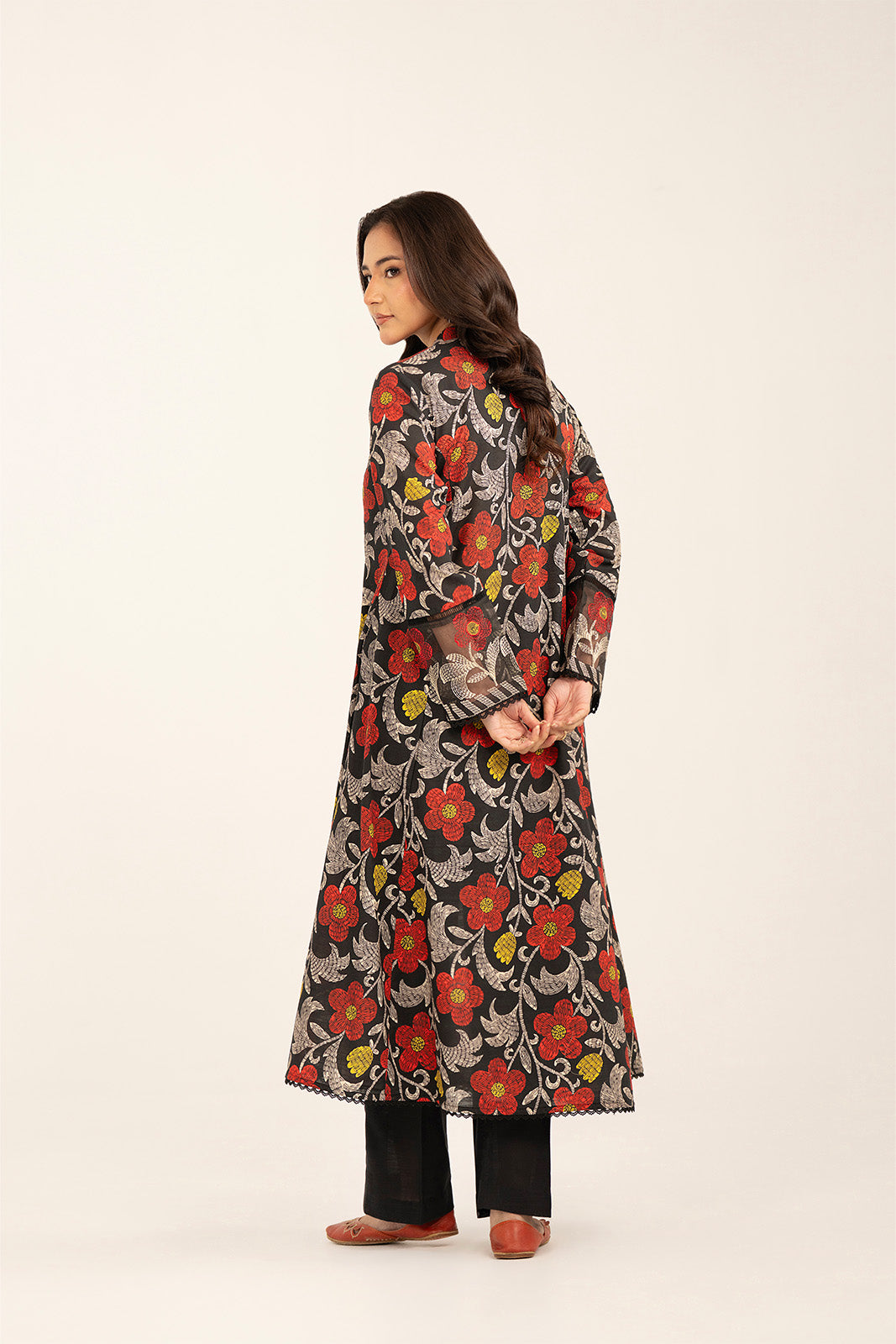 Article Name: ANITA Color: Black Fabric: Slub Khaddar Pieces: 2 Piece Shirt/Bottom Printed frock with button detail on neckline and embroidery on sheer organza on sleeves, paired with straight trouser.