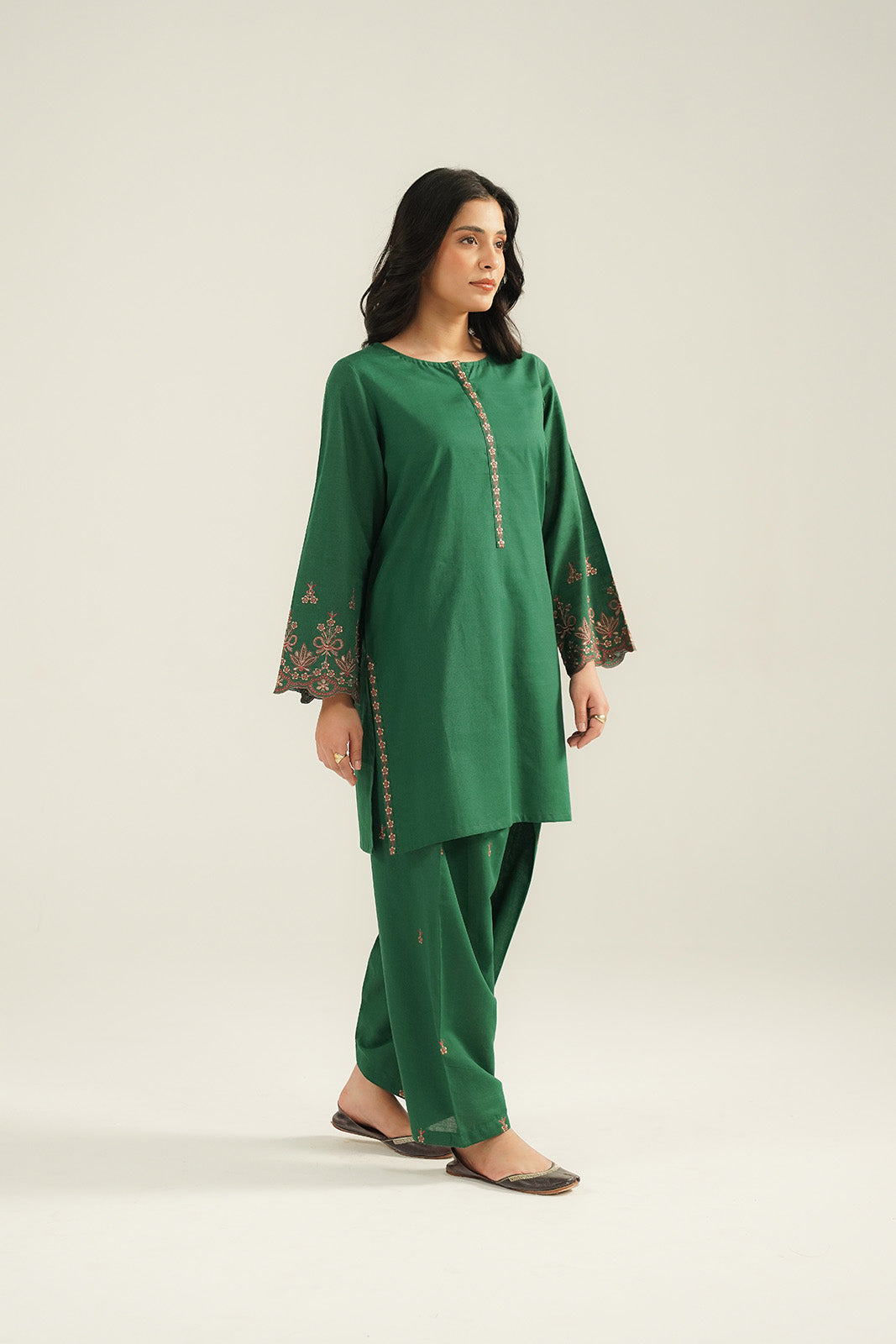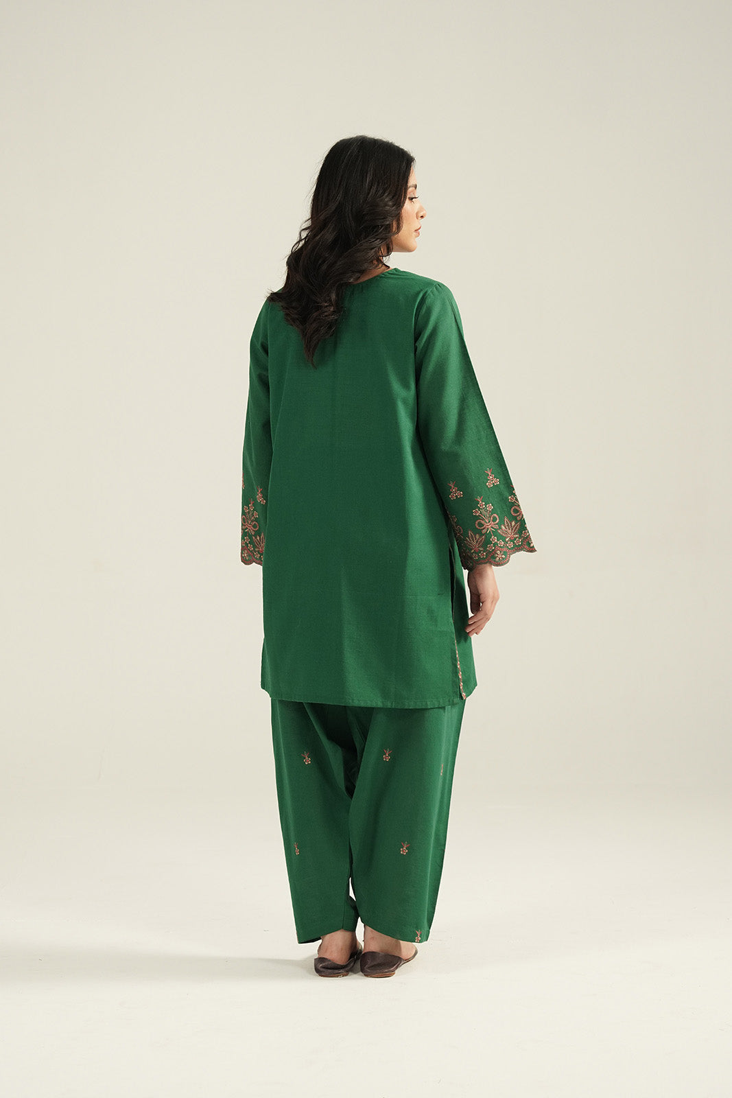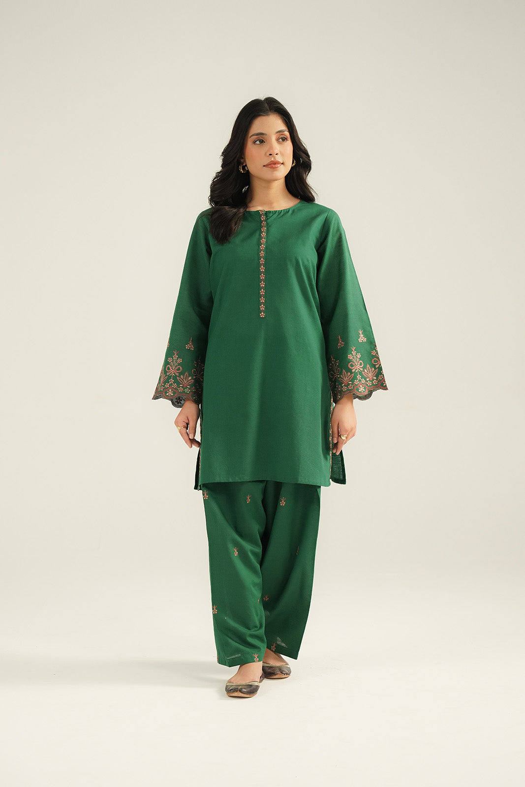 Article Name: PINE GREEN B Color: Green Fabric: Slub Khaddar Pieces: 2 Piece Shirt/Bottom Elegant daily wear embroidered two-piece suit featuring a short shirt embroidered paired with embroidered shalwar.