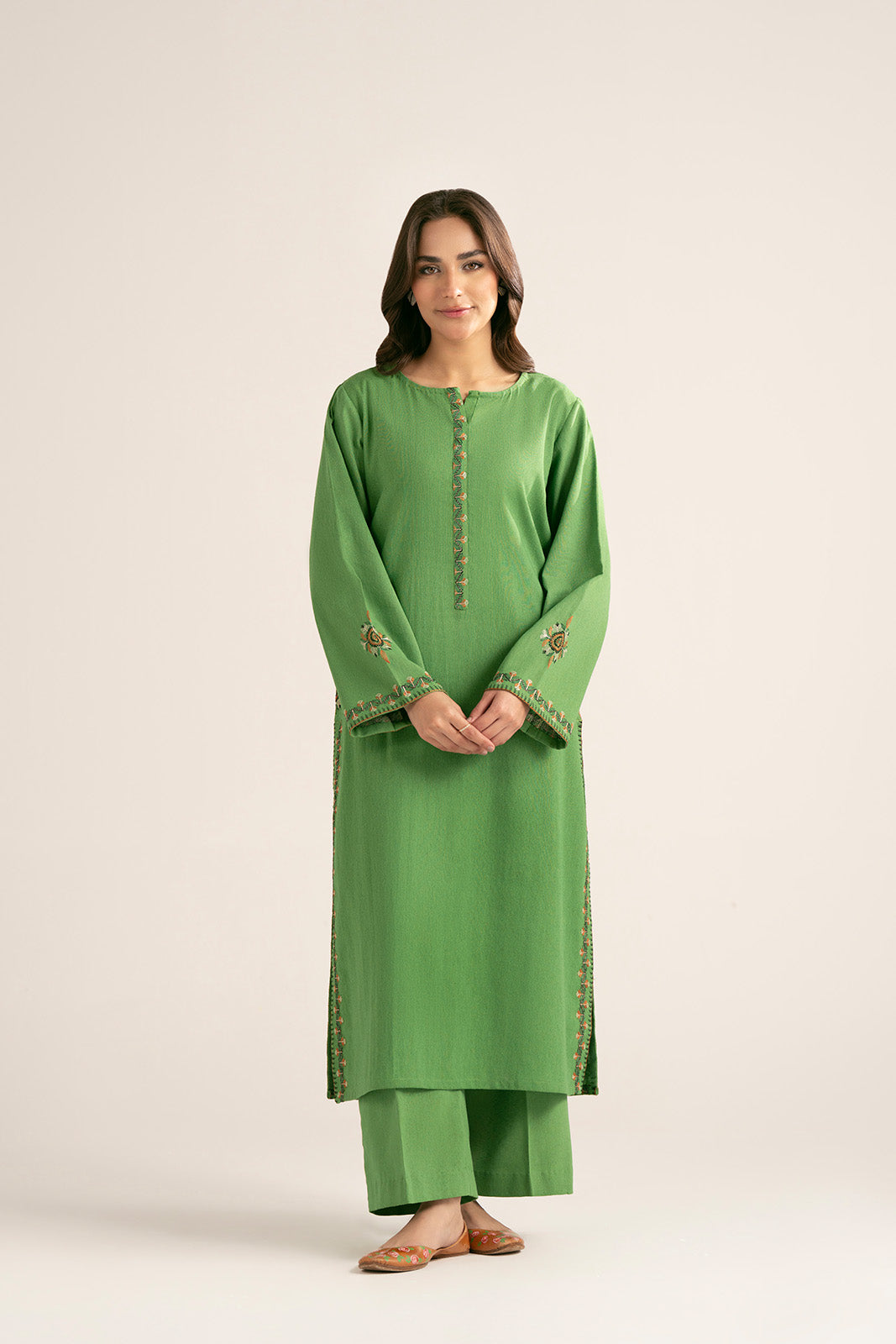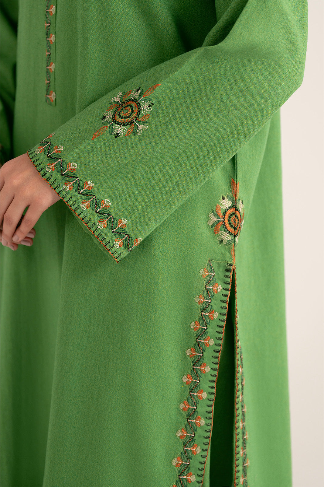 Article Name: CARIBBEAN Color: Green Fabric: Cotton Karandi Pieces: 2 Piece Shirt/Bottom Green Embroidered Two Piece Shirt Embroidered Detail is shirt Ride Shirt And On Sleeves Paral With Culottes