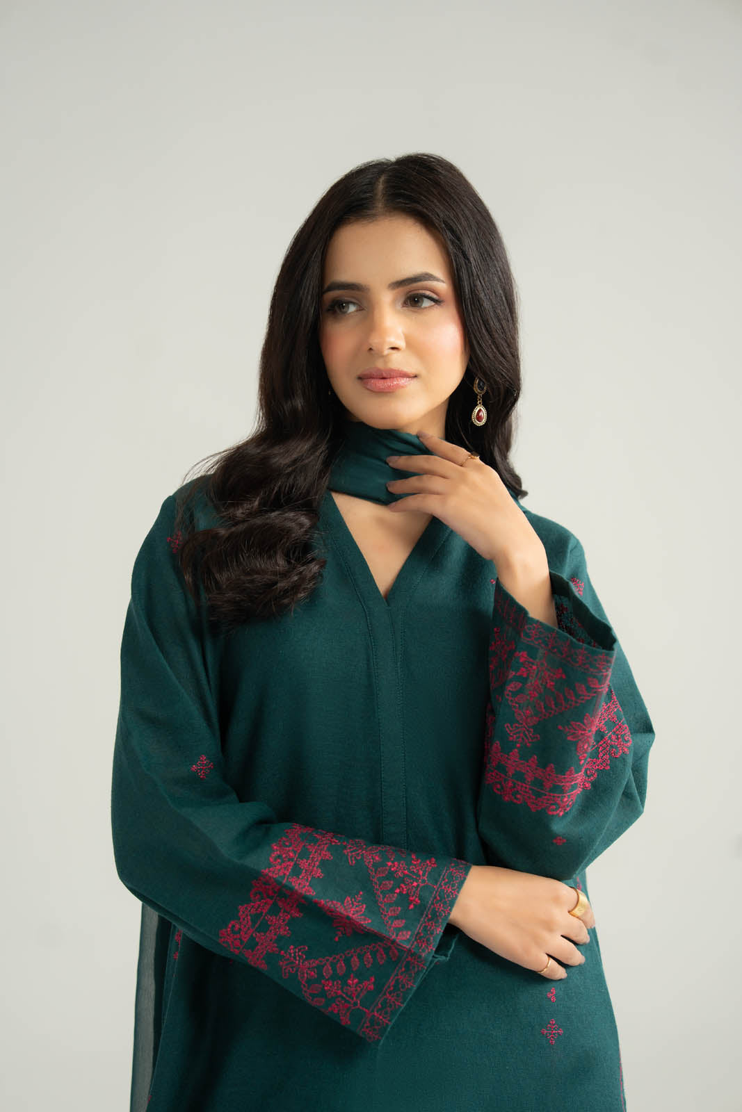Article Name: MEERAL W Color: Green Fabric: Cotton Karandi Pieces: 3 Piece Suit Three-piece suit, intricate embroidery on sleeves & front of shirt paired with trouser & chiffon dupatta.