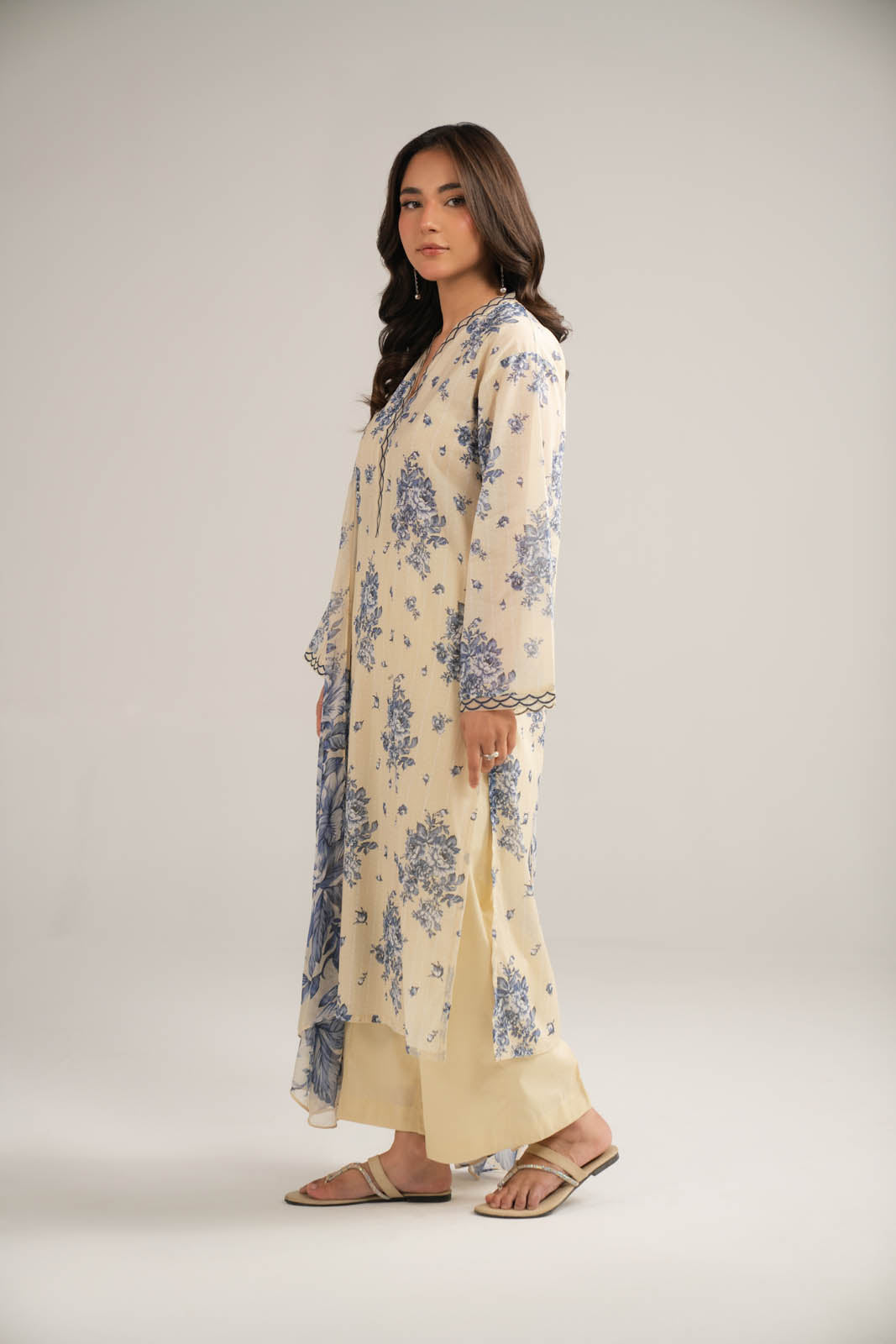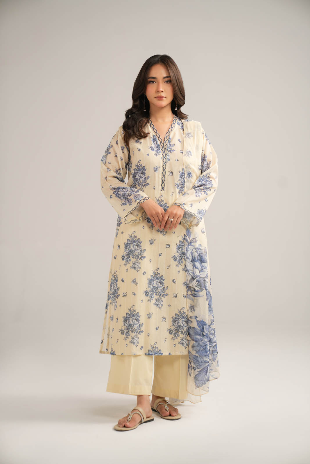 Article Name: MUHIB P Color: Off White Fabric: Printed Lawn Pieces: 3 Piece Suit Off-white printed shirt with embroidery detail on sleeves and neckline paired with cambric culottes and printed chiffon dupatta.