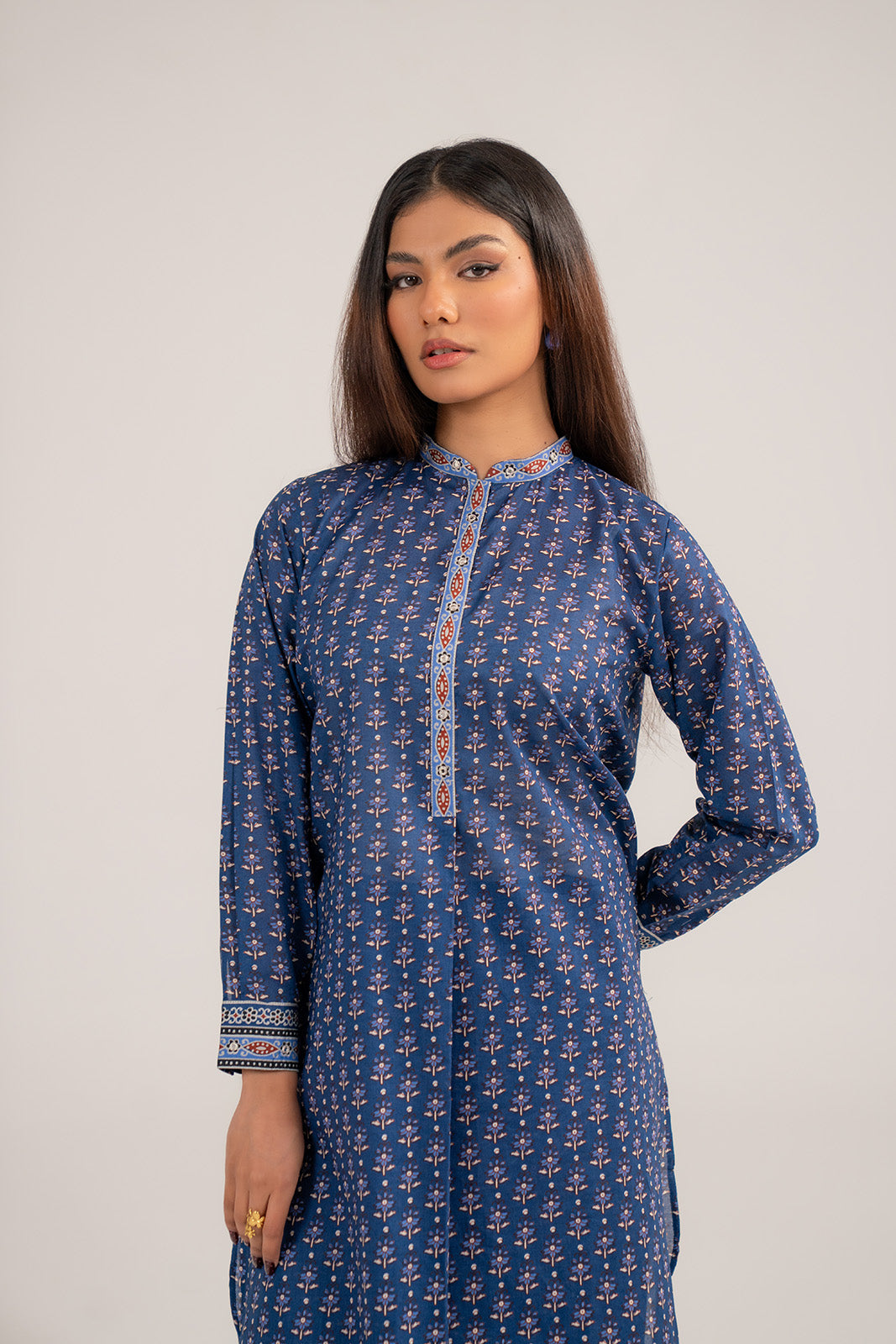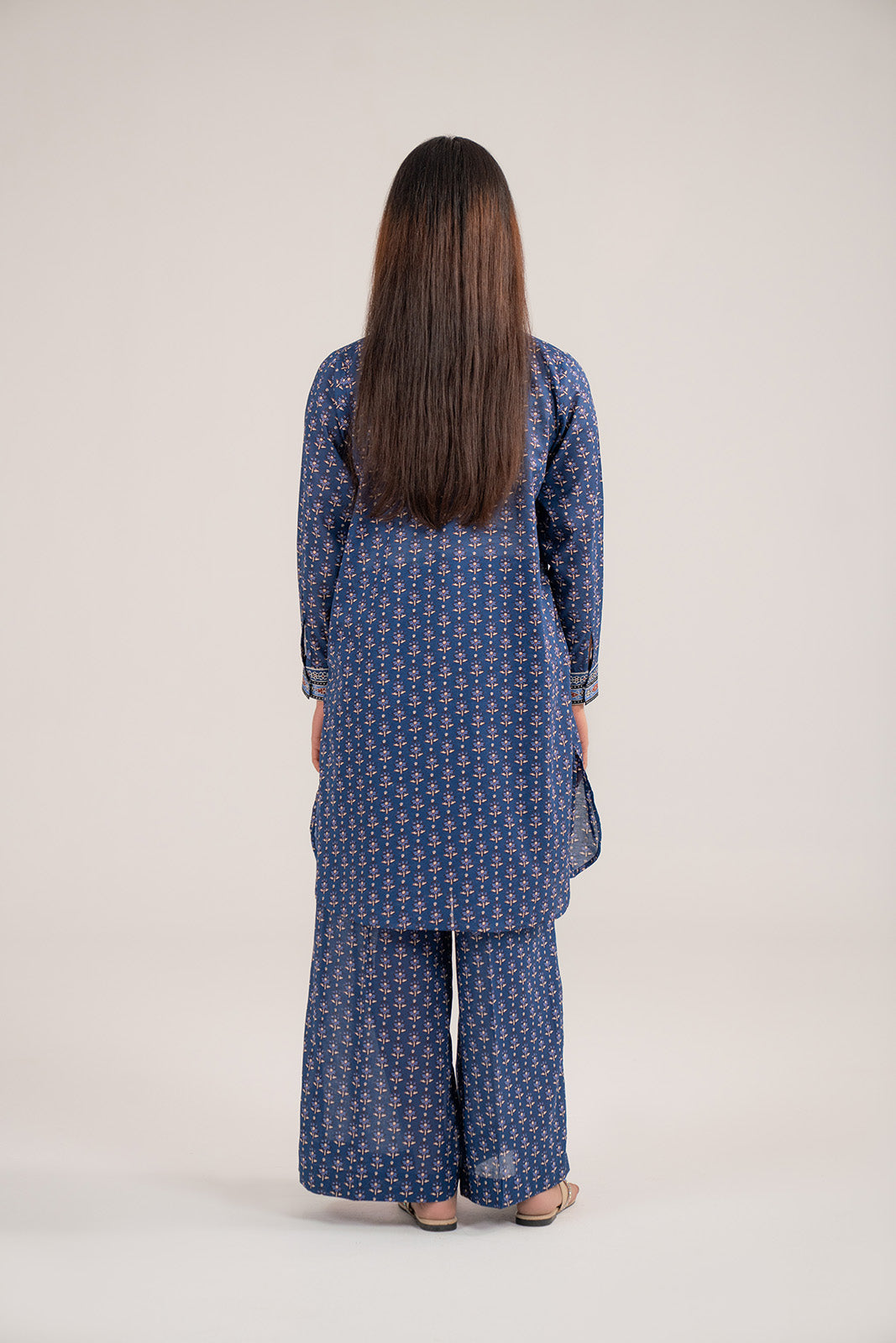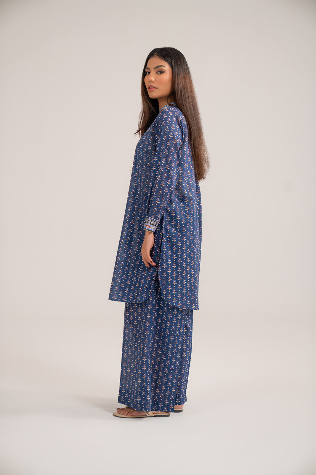 Article Name: IBTIDA P Color: Blue Fabric: Printed Lawn Pieces: 2 Piece Shirt/Bottom All over printed coord set with mirror work on placket and sleeves.