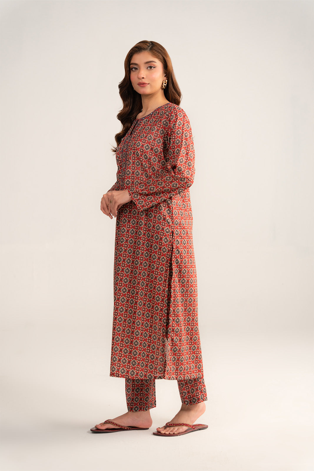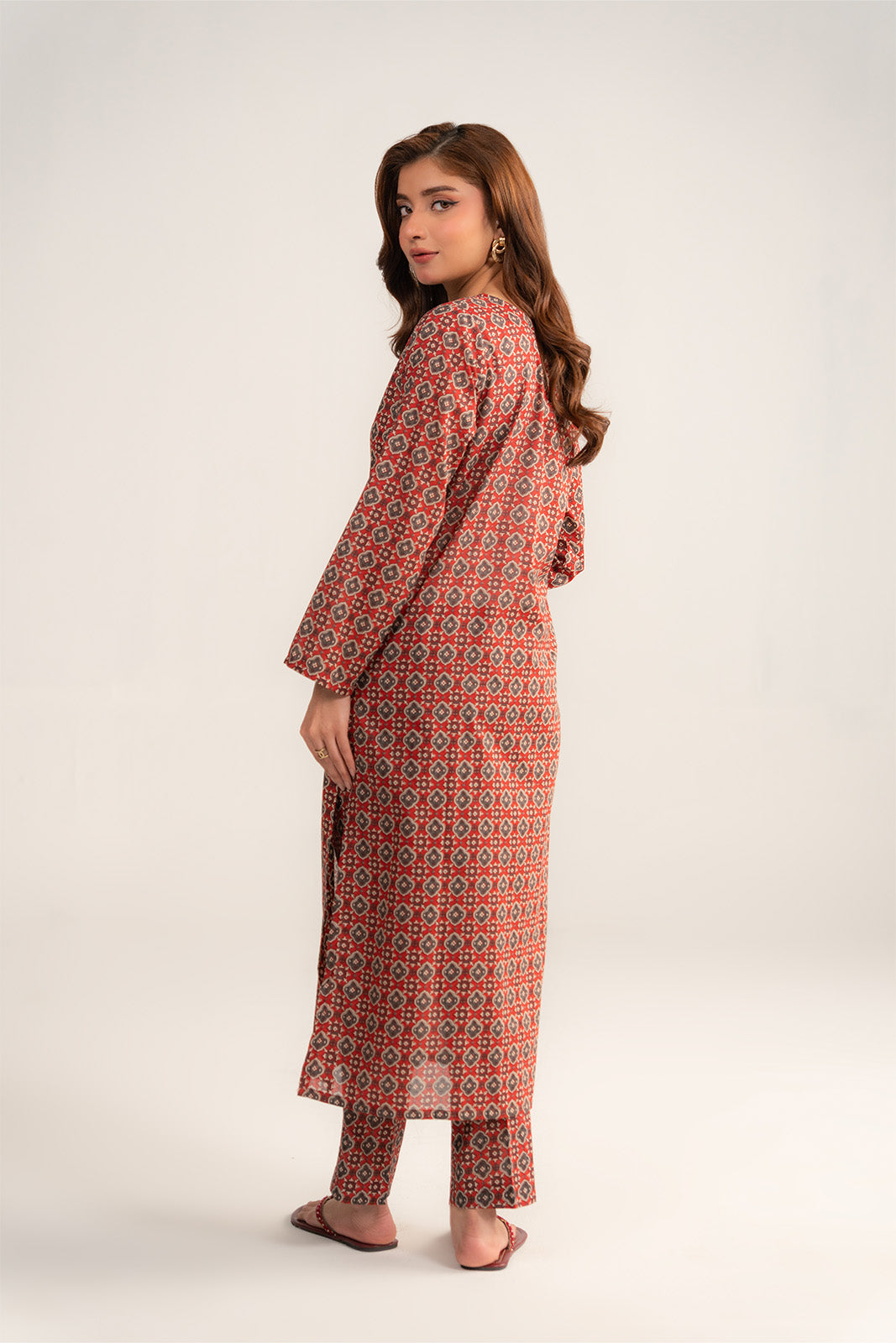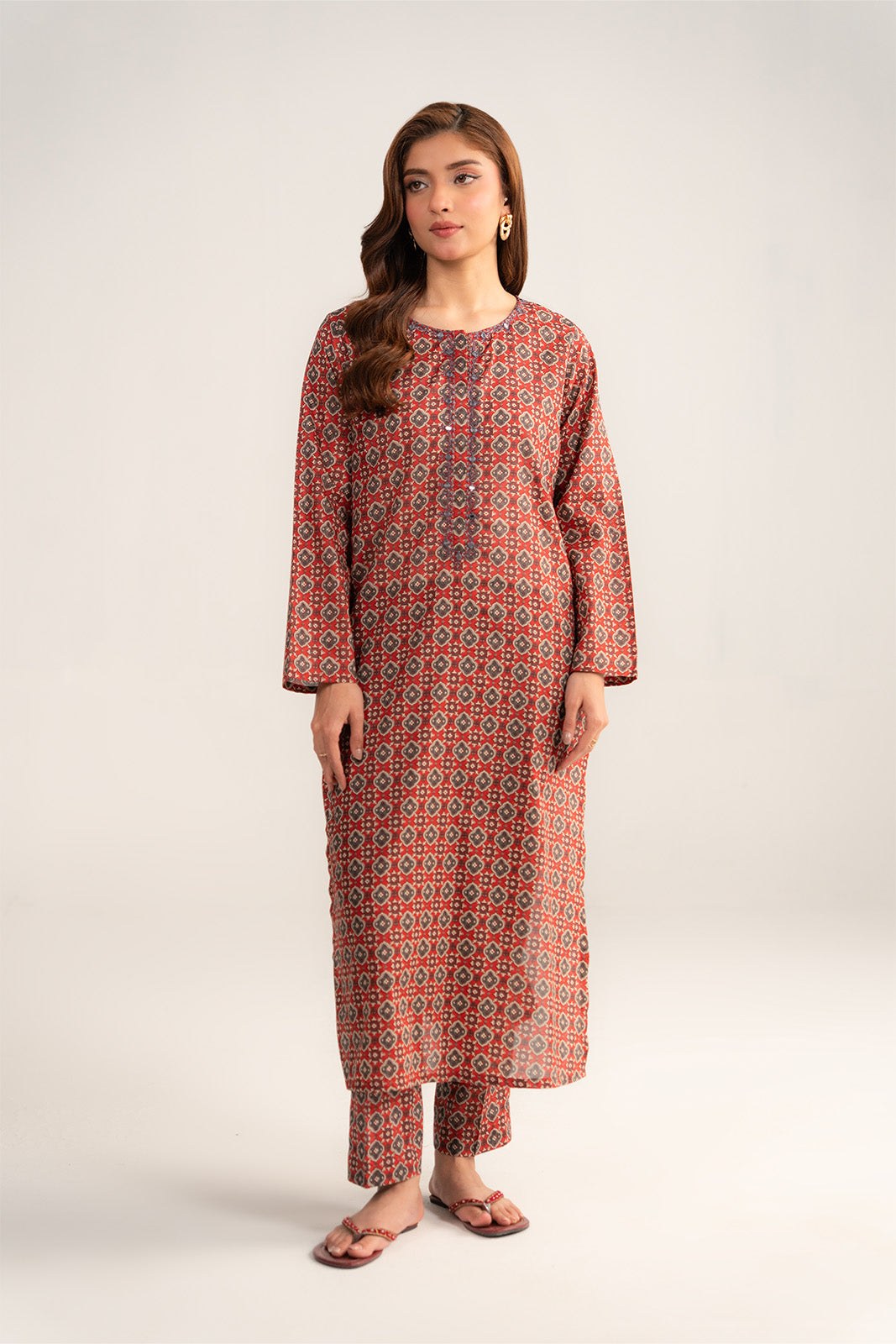 Article Name: FAYRA PColor: RustFabric: Printed LawnPieces: 2 Piece Shirt/BottomPrinted stitched 2 piece, along with mirror work neckline.
