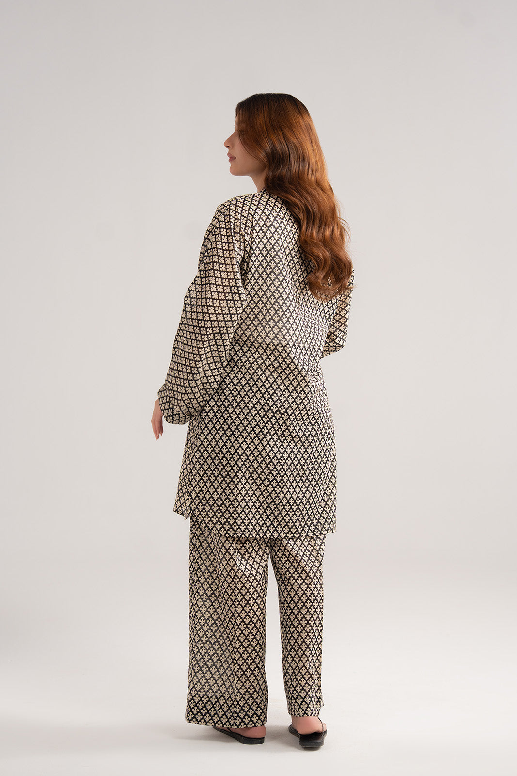 Article Name: ZIVA P Color: Black Fabric: Printed Lawn Pieces: 2 Piece Shirt/Bottom Black printed lawn 2-piece suit detailed with embroidered & embellishment on shirt & paired with plazzo.