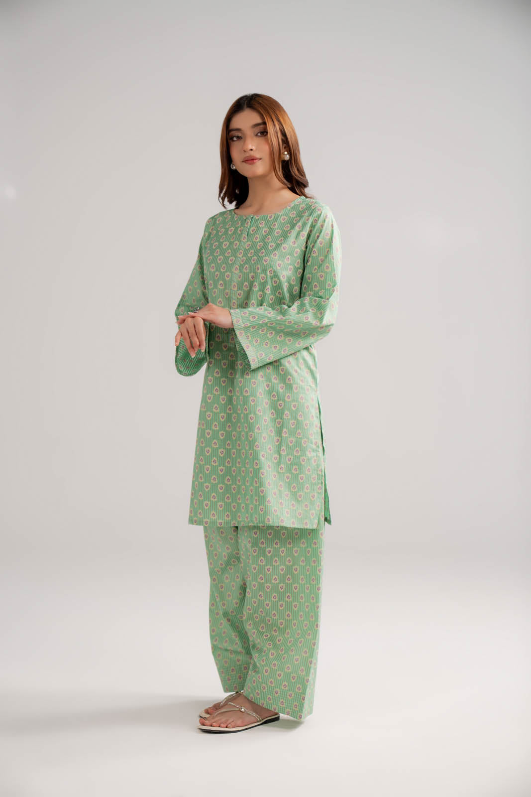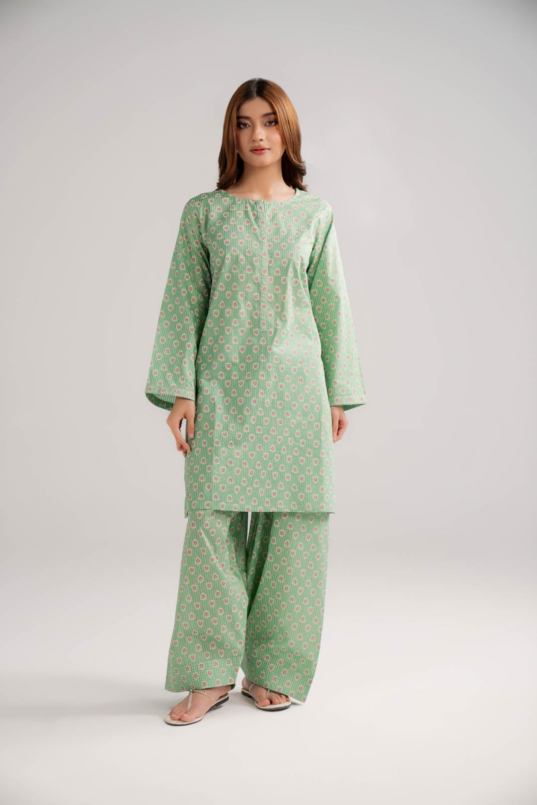 Article Name: ARZOO P Color: Sea Green Fabric: Printed Lawn Pieces: 2 Piece Shirt/Bottom Printed short shirt with top stitch detail on placket paired with a farshi shalwar.