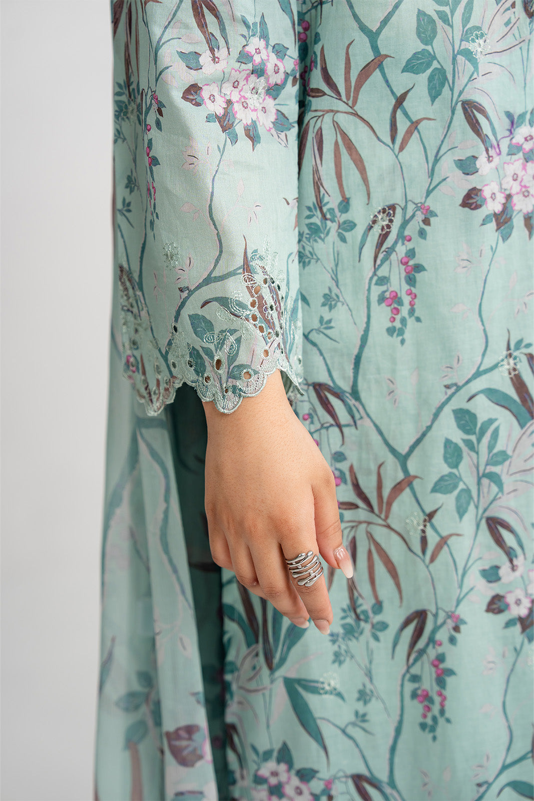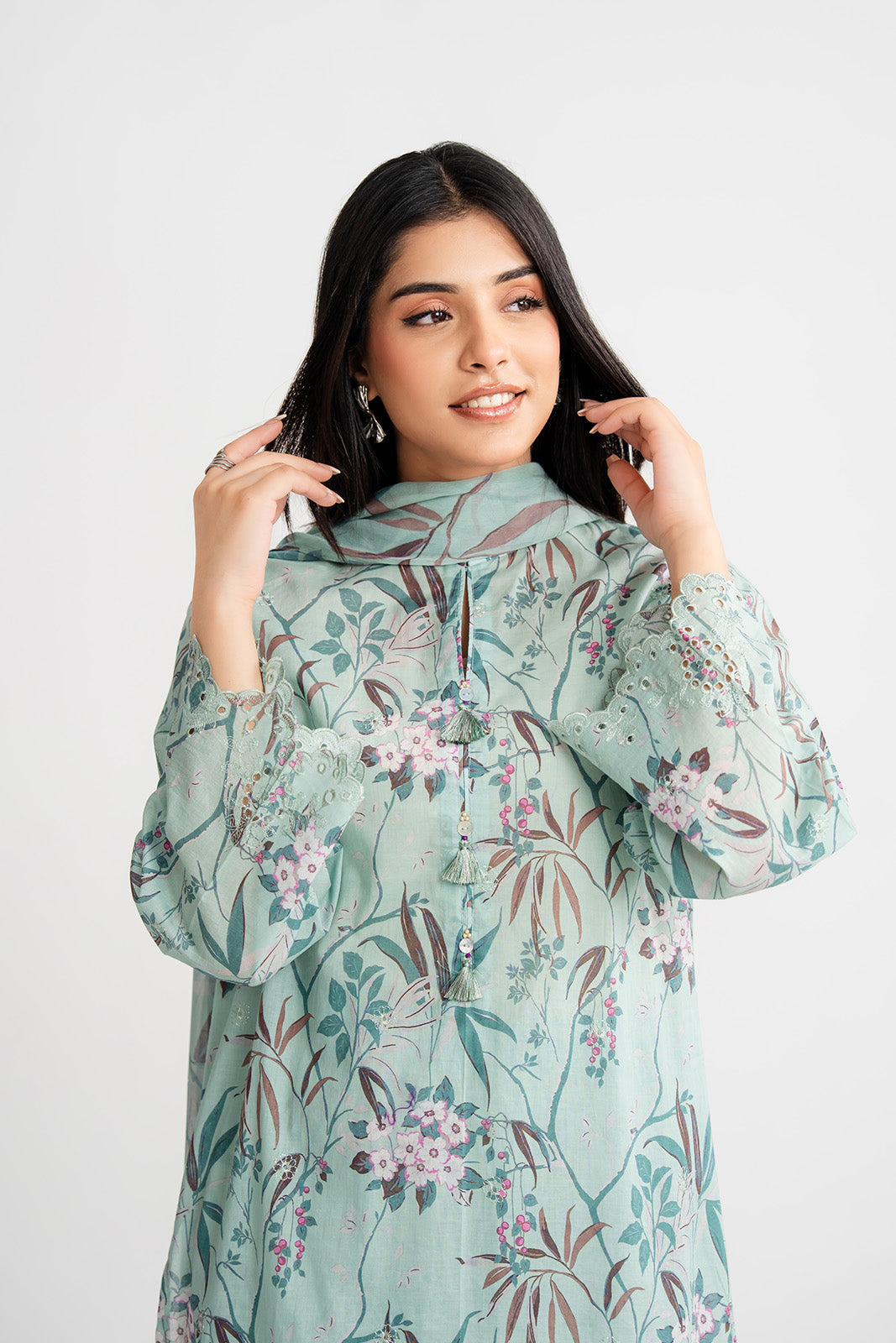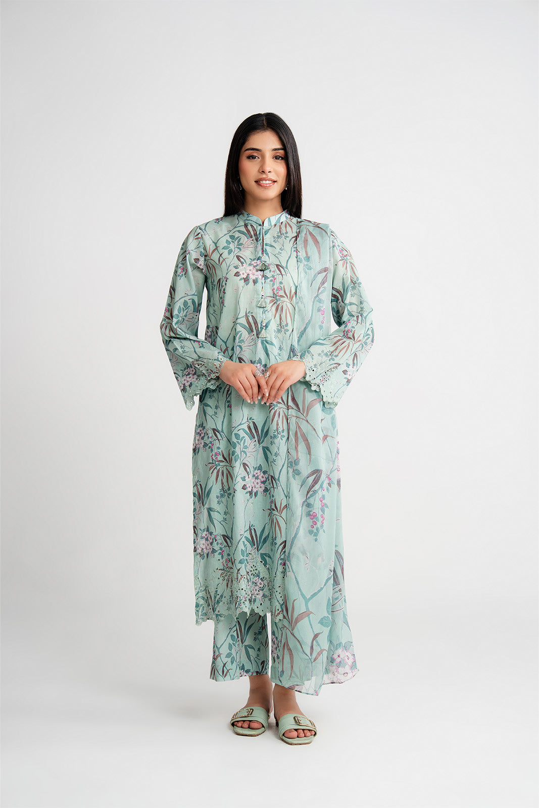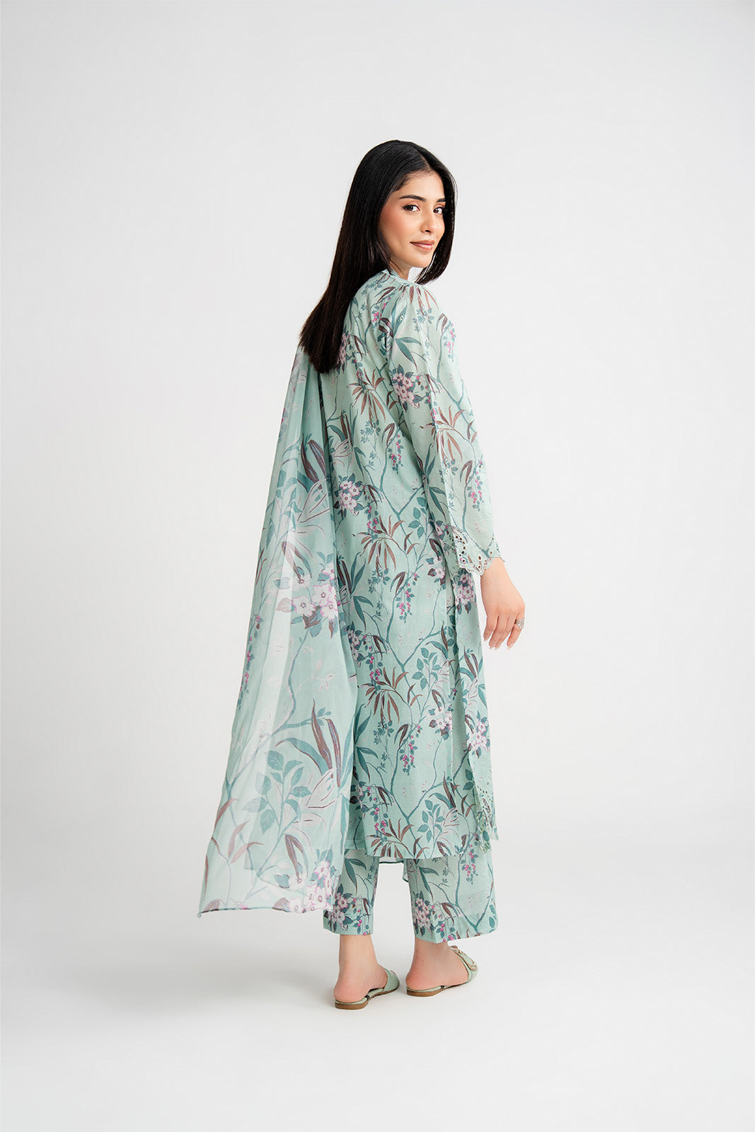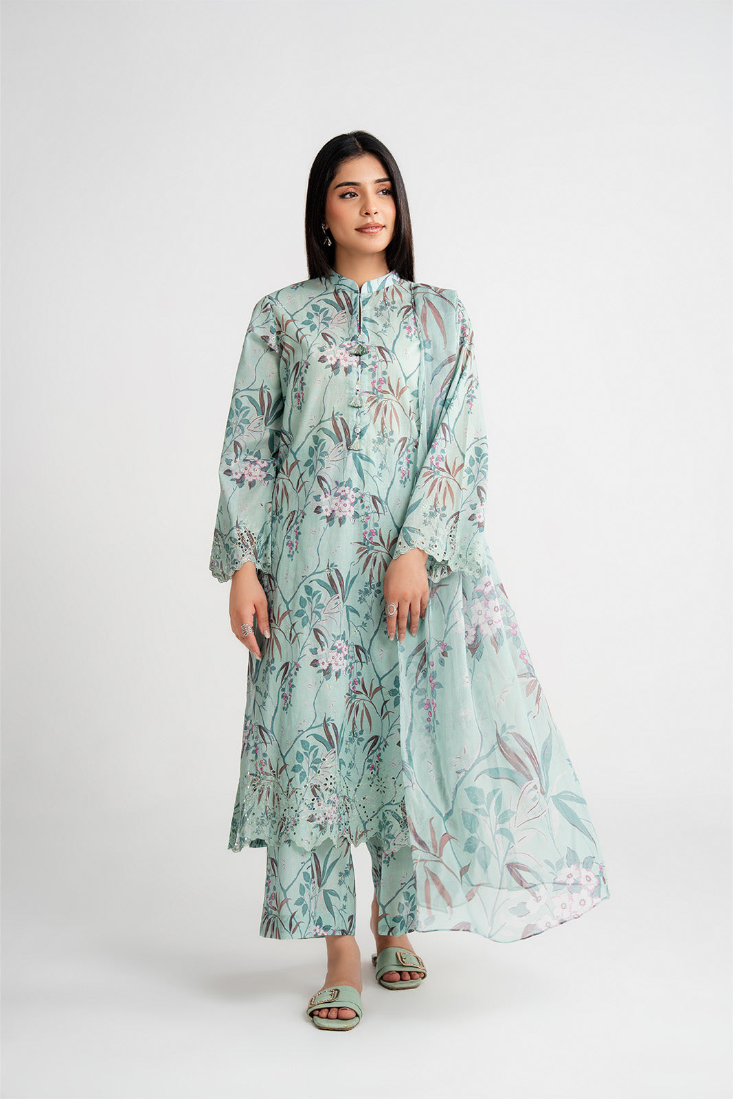 Article Name: AQUAMARINE P Color: Light Green Fabric: Printed Lawn Pieces: 3 Piece Suit 3 Piece Printed light green suit with embroidered border paired with printed culottes and chiffon dupatta.