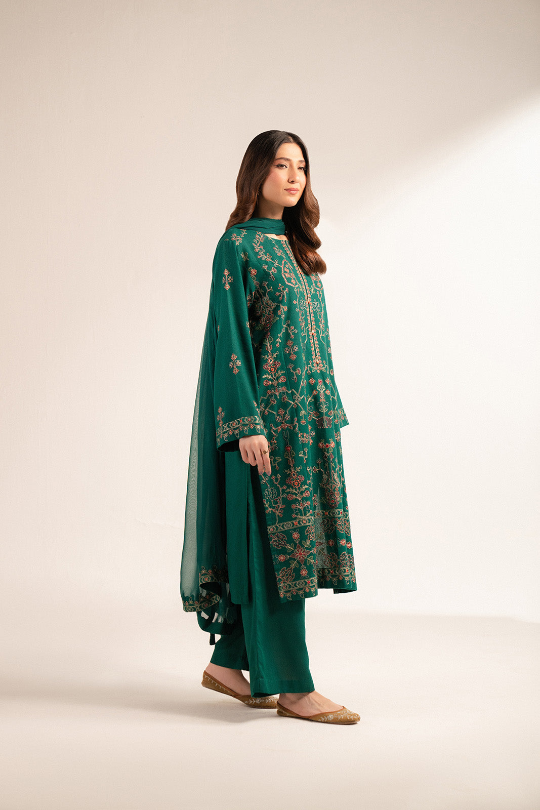 Article Name: ARHAAB Color: Green Fabric: Lawn Karandi Pieces: 3 Piece Suit Green embroidered three piece suit detailed with embroidered shirt and chiffon dupatta with embroidered pallu and lawn karandi culottes.