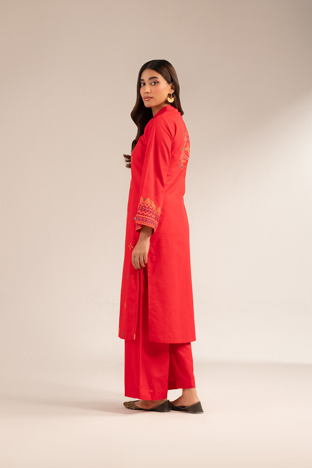 Article Name: LIORA B Color: Red Fabric: Slub Khaddar Pieces: 2 Piece Shirt/Bottom Red slub khaddar embroidered 2-pcs suit, detailed with mirror work and tasseling on neckline paired with culottes.