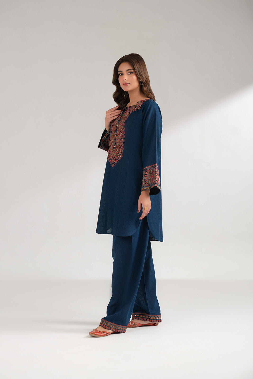 DetailsArticle Name: GIVING NEST FColor: TealFabric: Slub KhaddarPieces: 2 Piece Shirt/BottomTeal khaddar coord set with embroidery on neck and culottes.