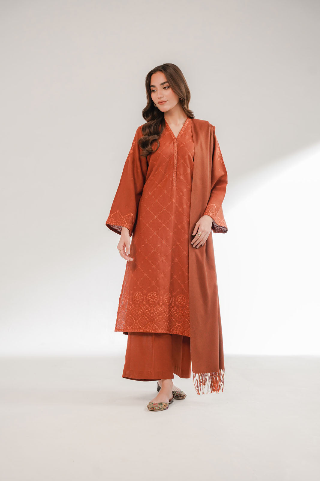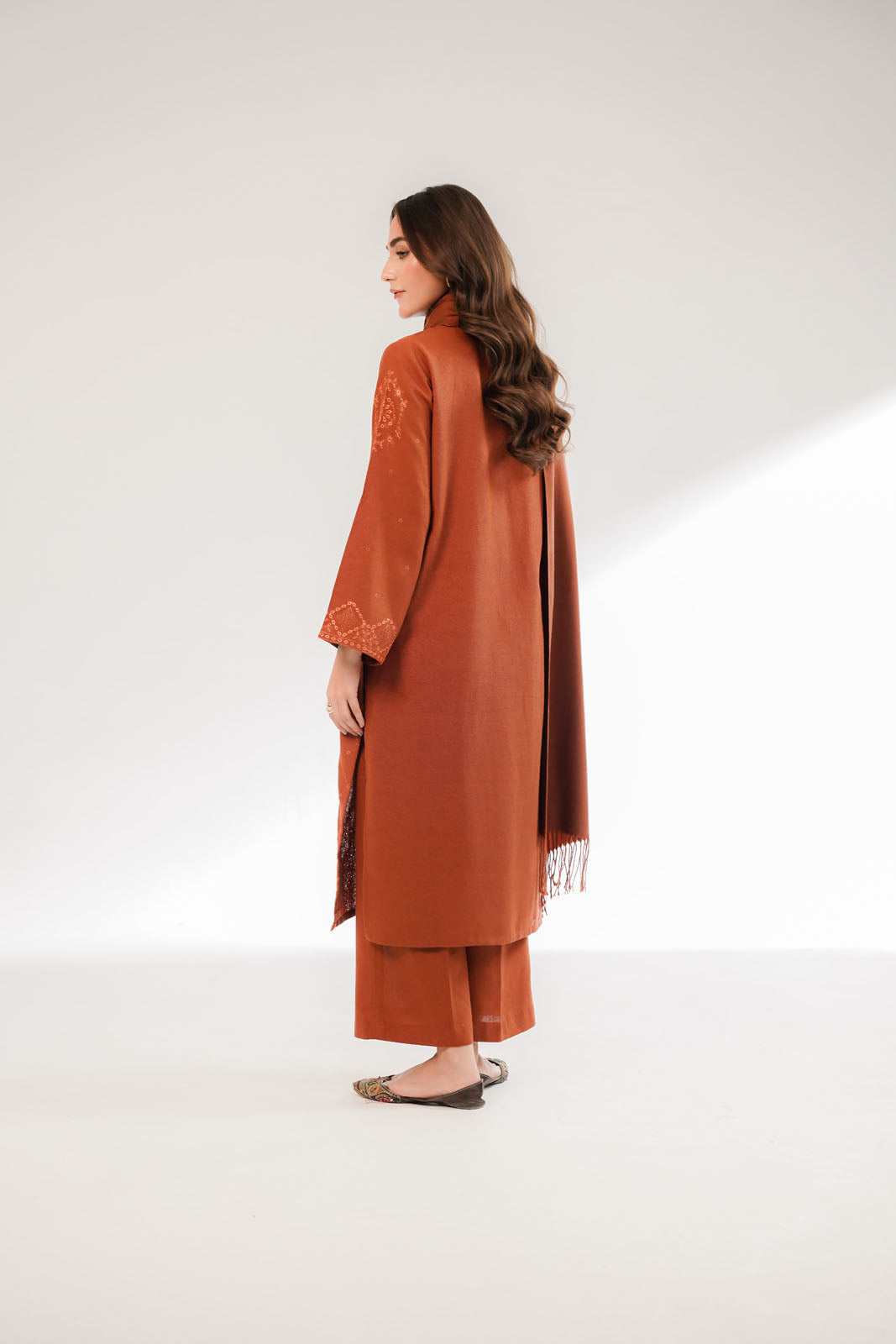 Article Name: MAHOGANY M Color: Ivory Fabric: Cotton Karandi Pieces: 3 Piece Suit Brown cotton karandi embroidered 3-piece suit detailed with embroidered shirt paired with culottes and Nepali wool stole.