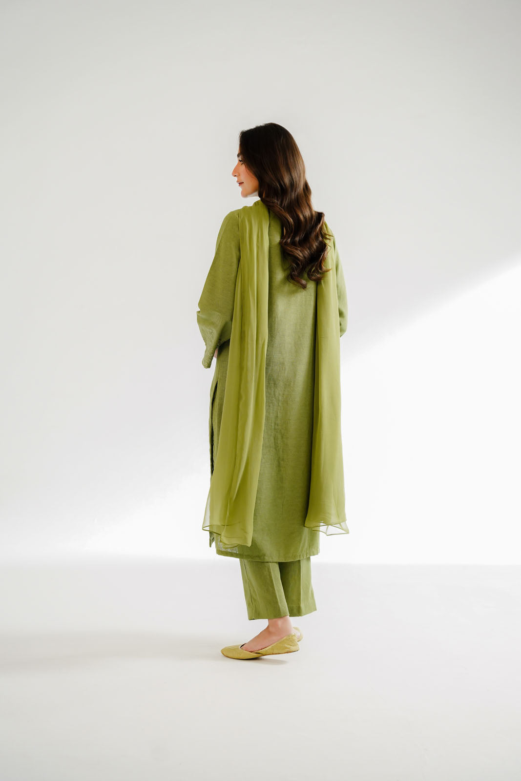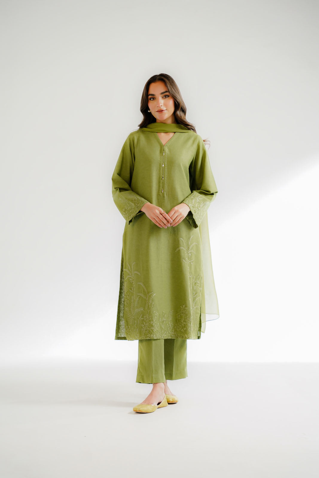Article Name: SAMAHA Color: Green Fabric: Cotton Karandi Pieces: 3 Piece Suit Make a statement with our green embroidered three-piece suit, embroidered straight shirt paired with trouser & plain chiffon dupatta with tassels.