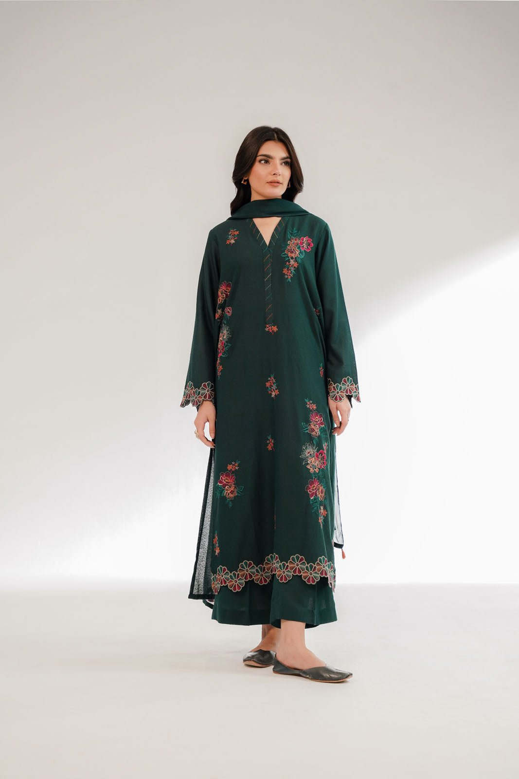 Article Name: ZENEL Color: Green Fabric: Lawn Karandi Pieces: 3 Piece Suit Make a statement with our green three-piece suit, embroidered straight shirt overlap neckline paired with culottes & chiffon dupatta detailed with tassels.