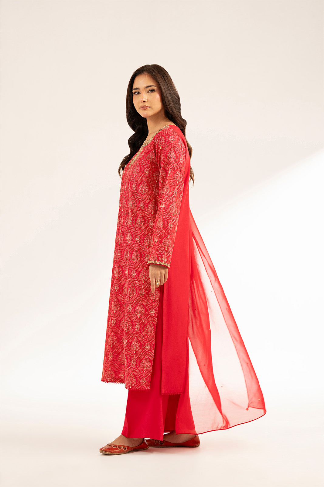 Article Name: DILHAColor: RedFabric: Lawn KarandiPieces: 3 Piece Suit3-Piece embroidered lawn karandi suit embroidered allover shirt along with adda work neckline chiffon dupatta and plain trouser.