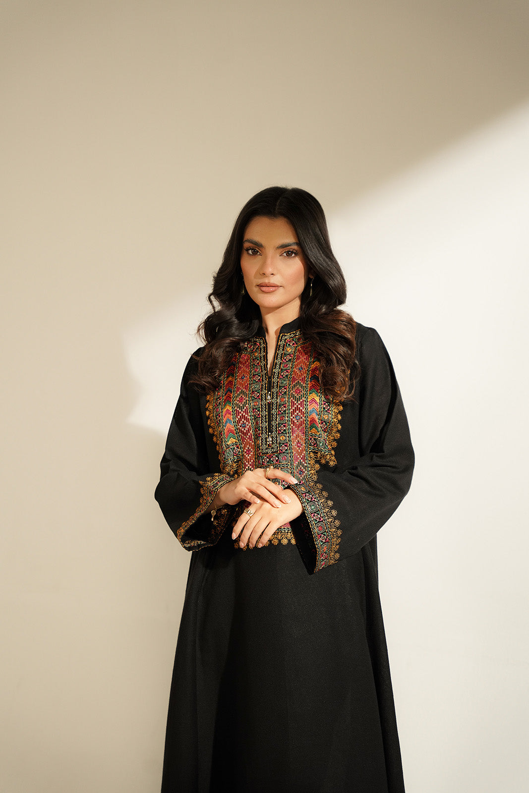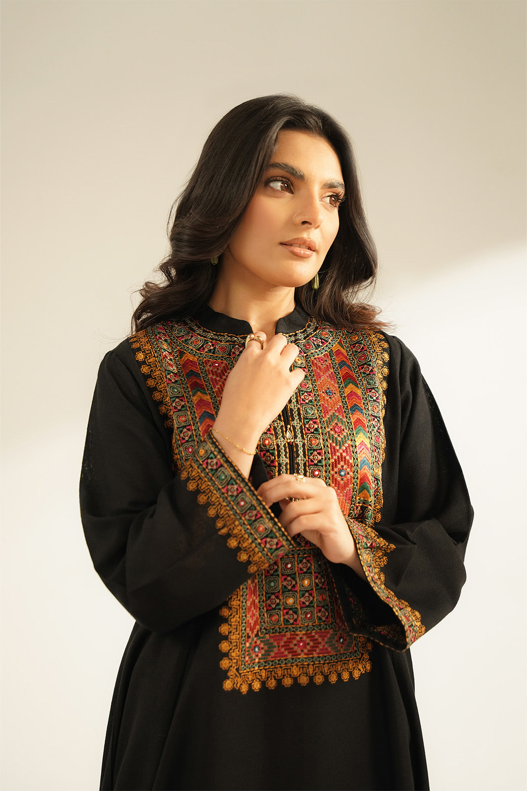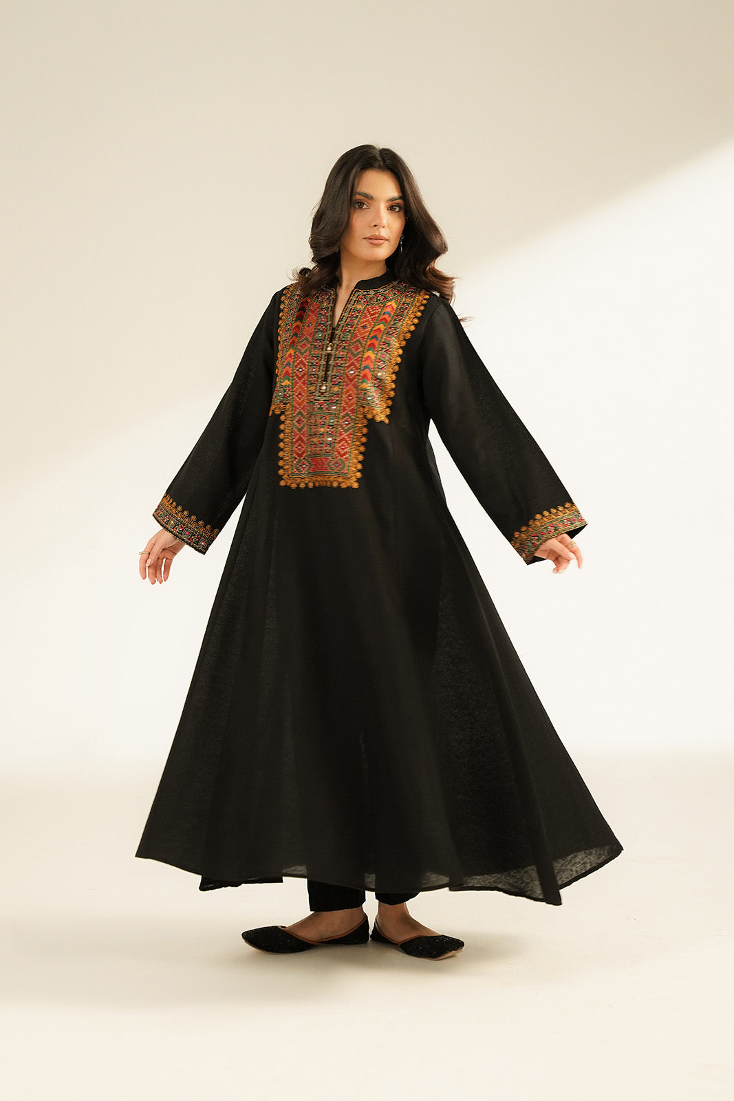Article Name: ZAR E GUL I Color: Black Fabric: Cotton Karandi Pieces: 1 Piece Shirt delicate embroidered flary frock in black detailed with colorful embroidery & mirror work.