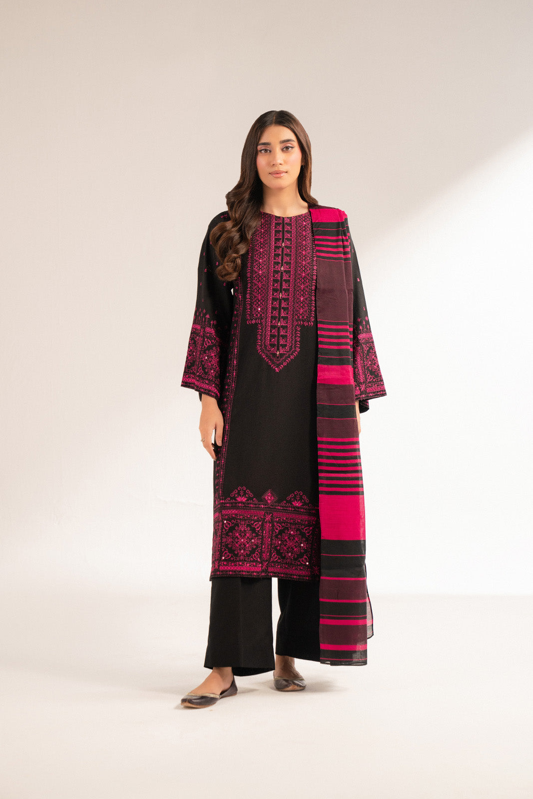 Article Name: REHAL Color: Black Fabric: Lawn Karandi Pieces: 3 Piece Suit Black three-piece suit featuring an embroidered long shirt with mirror work detailed paired with cotton silk fairy dupatta & culottes.