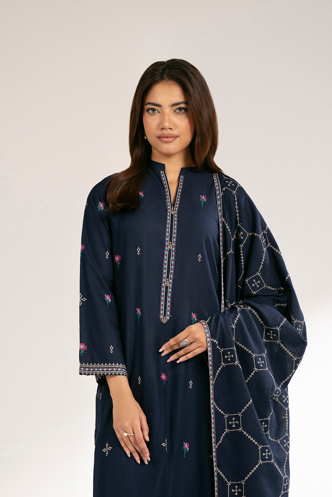 3-Piece suit with cross stitch embroidery on shirt intricate floral embroidery on front & sleeves neckline detailed with button paired with embroidered shawl & culottes.