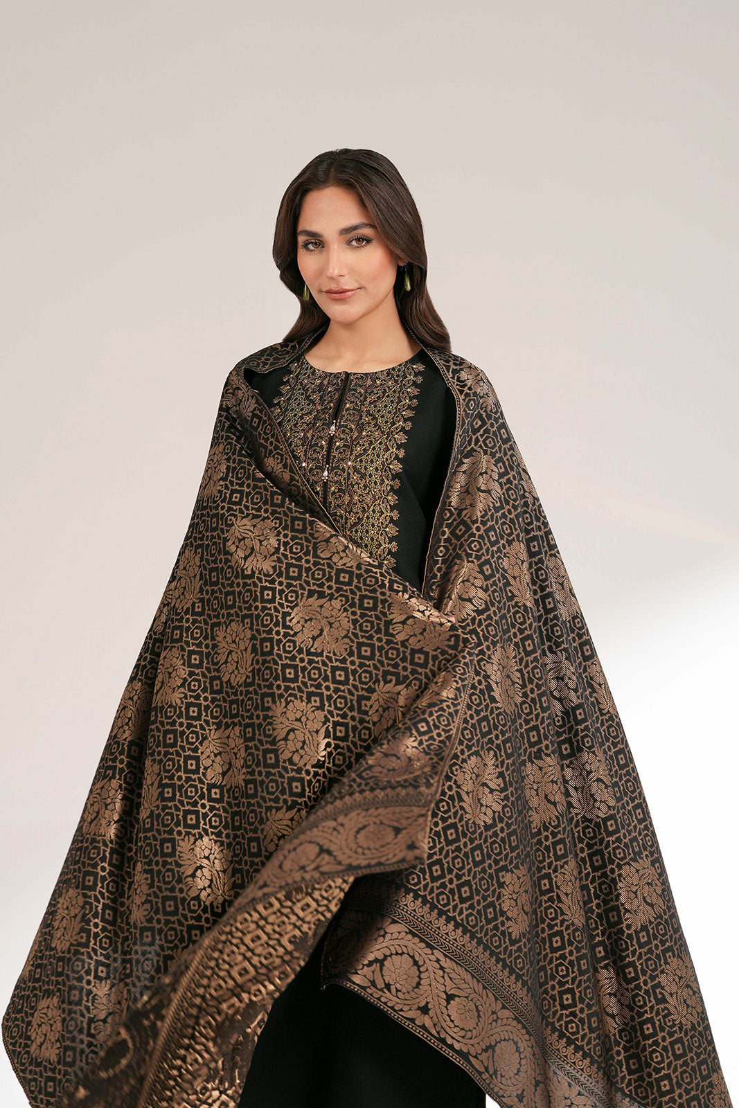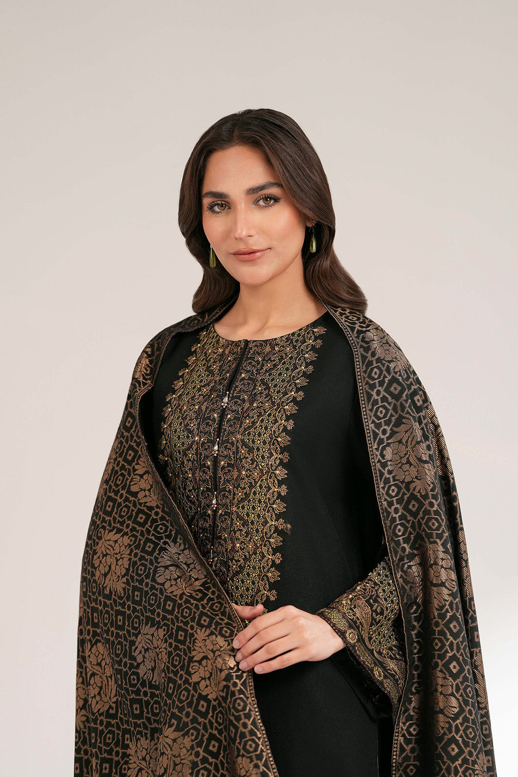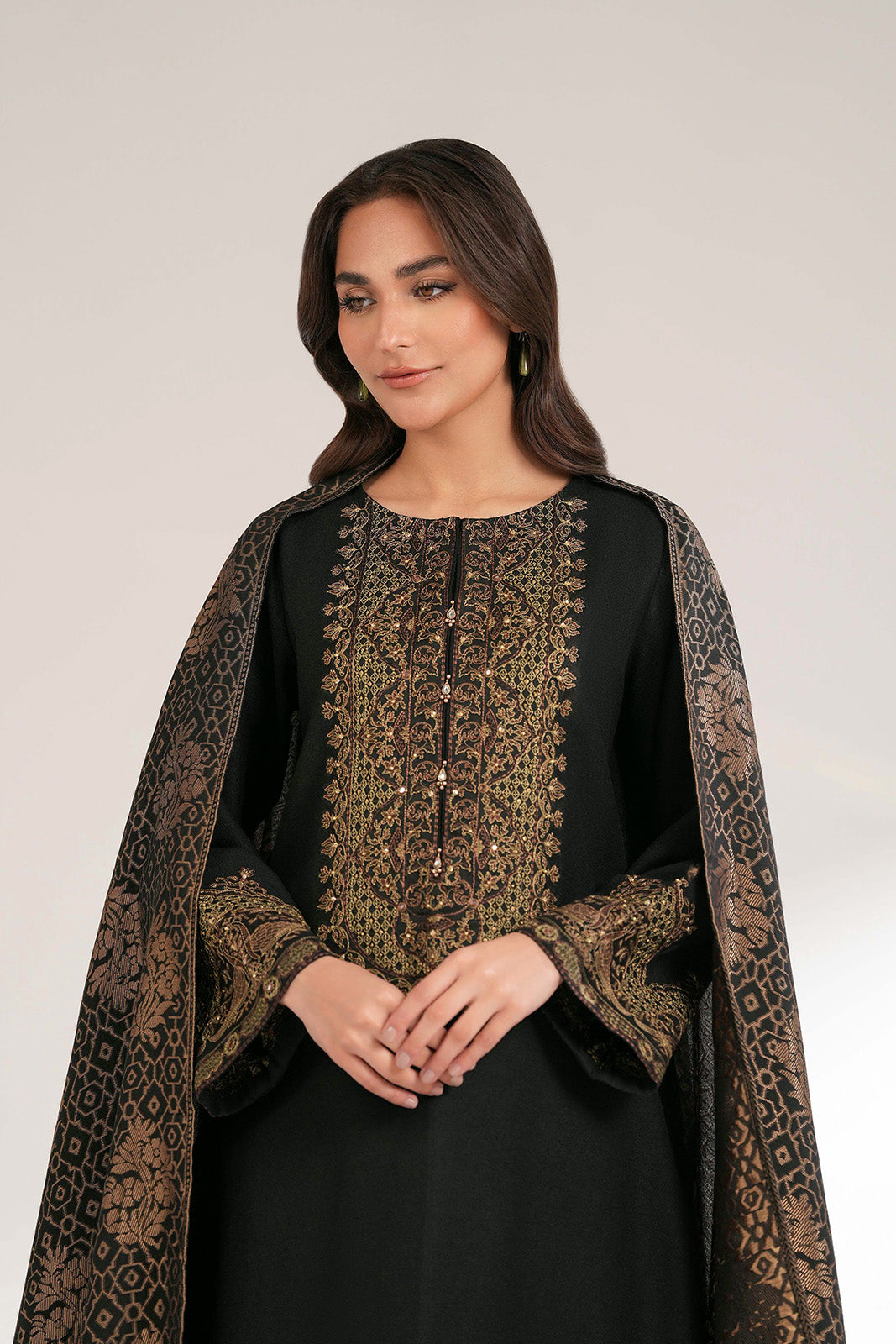 Article Name: NILAN I Color: Black Fabric: Cotton Karandi Pieces: 3 Piece Suit 3-Piece black cotton karandi suit with embellished detailing, sequins, mirror and beads paired with culottes and jacquard dupatta.
