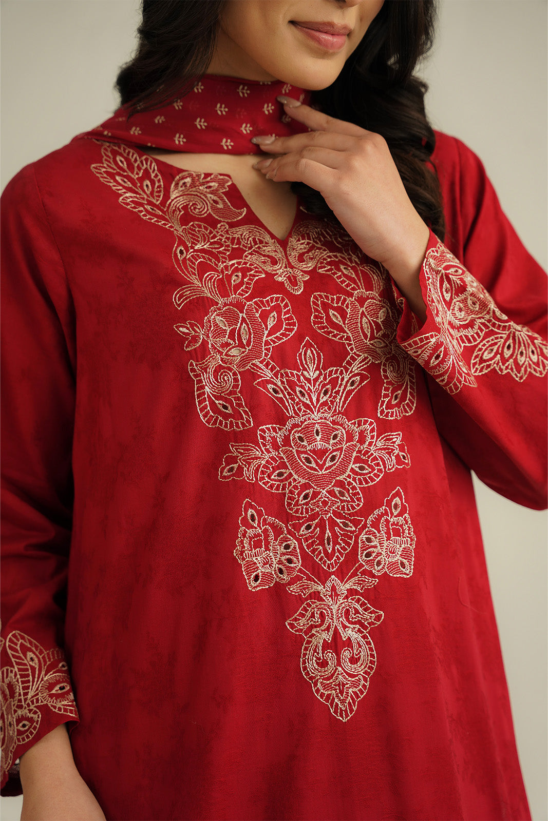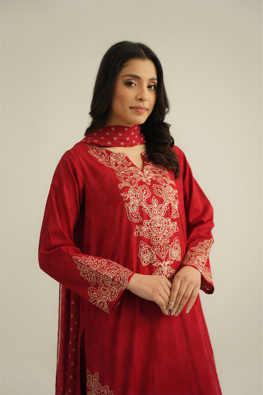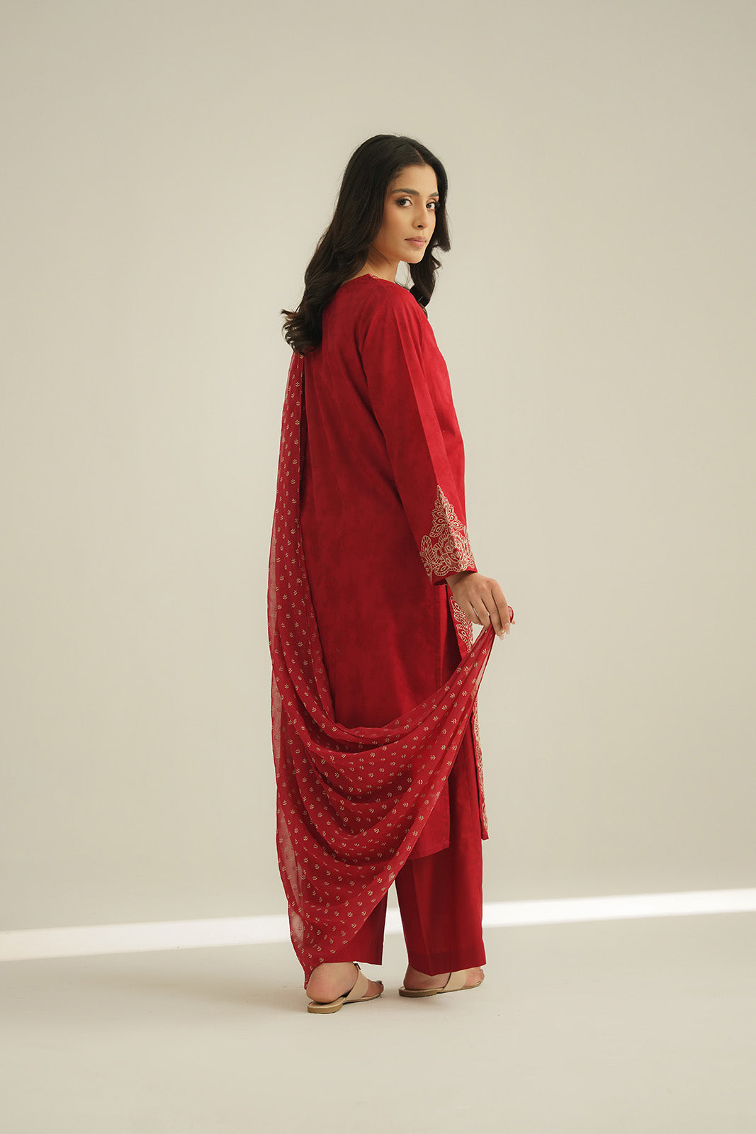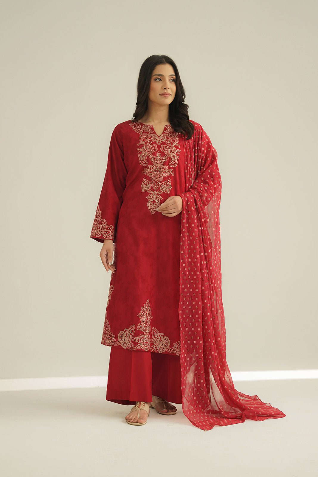 Article Name: CRIMSON S P Color: Red Fabric: Dobby Pieces: 3 Piece Suit Red dobby lawn embroidered shirt paired up with printed chiffon dupatta & cambric culottes.