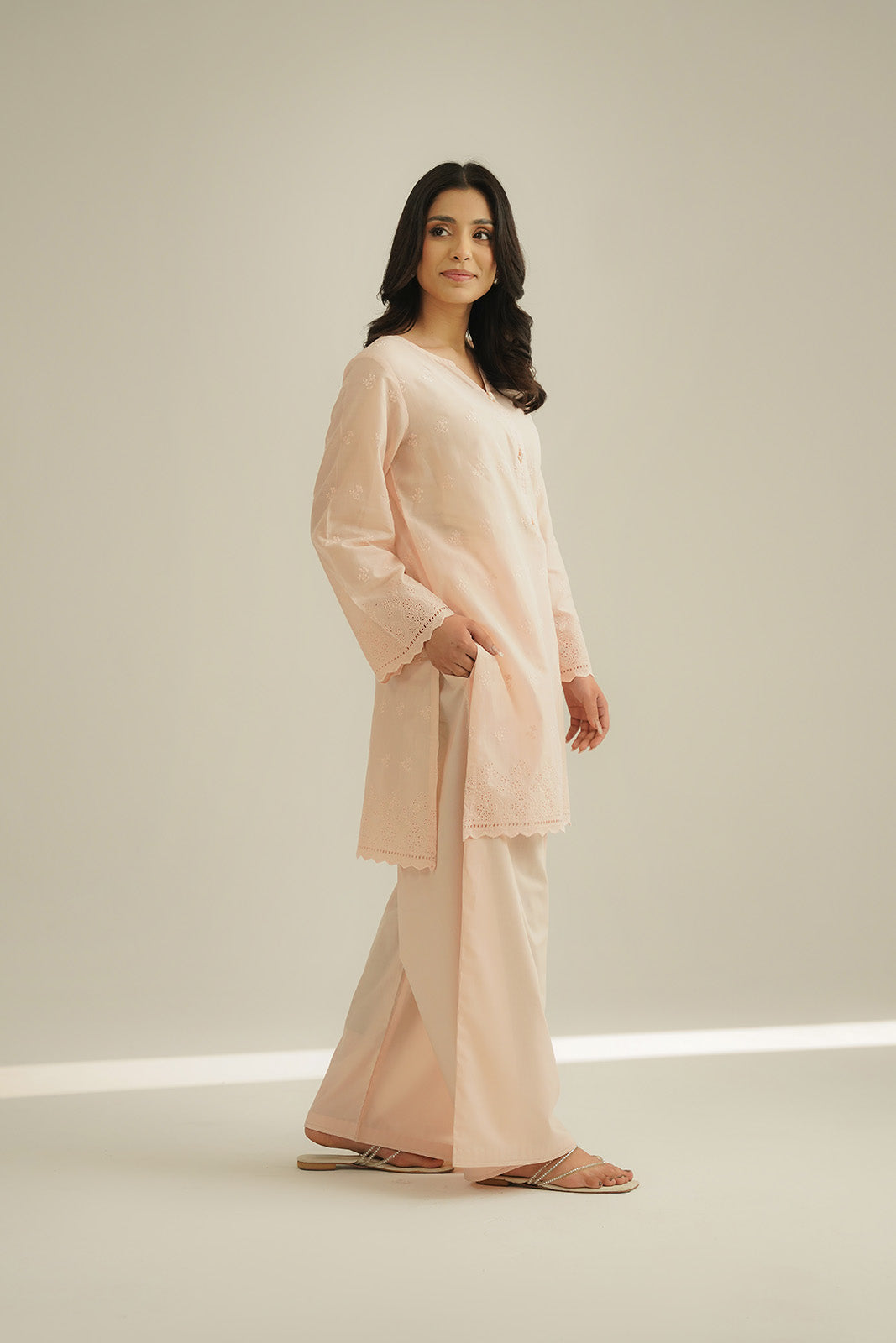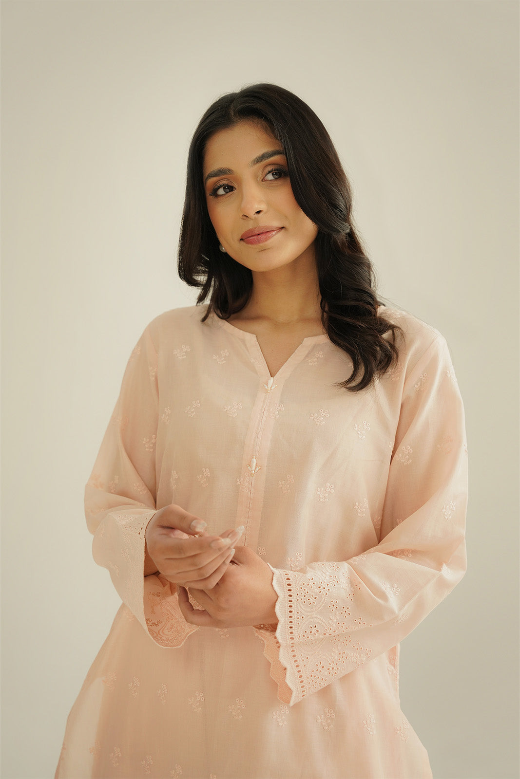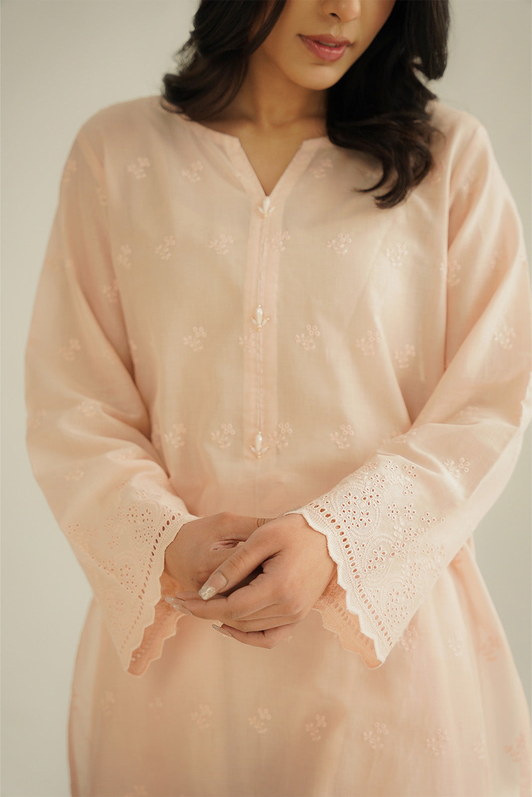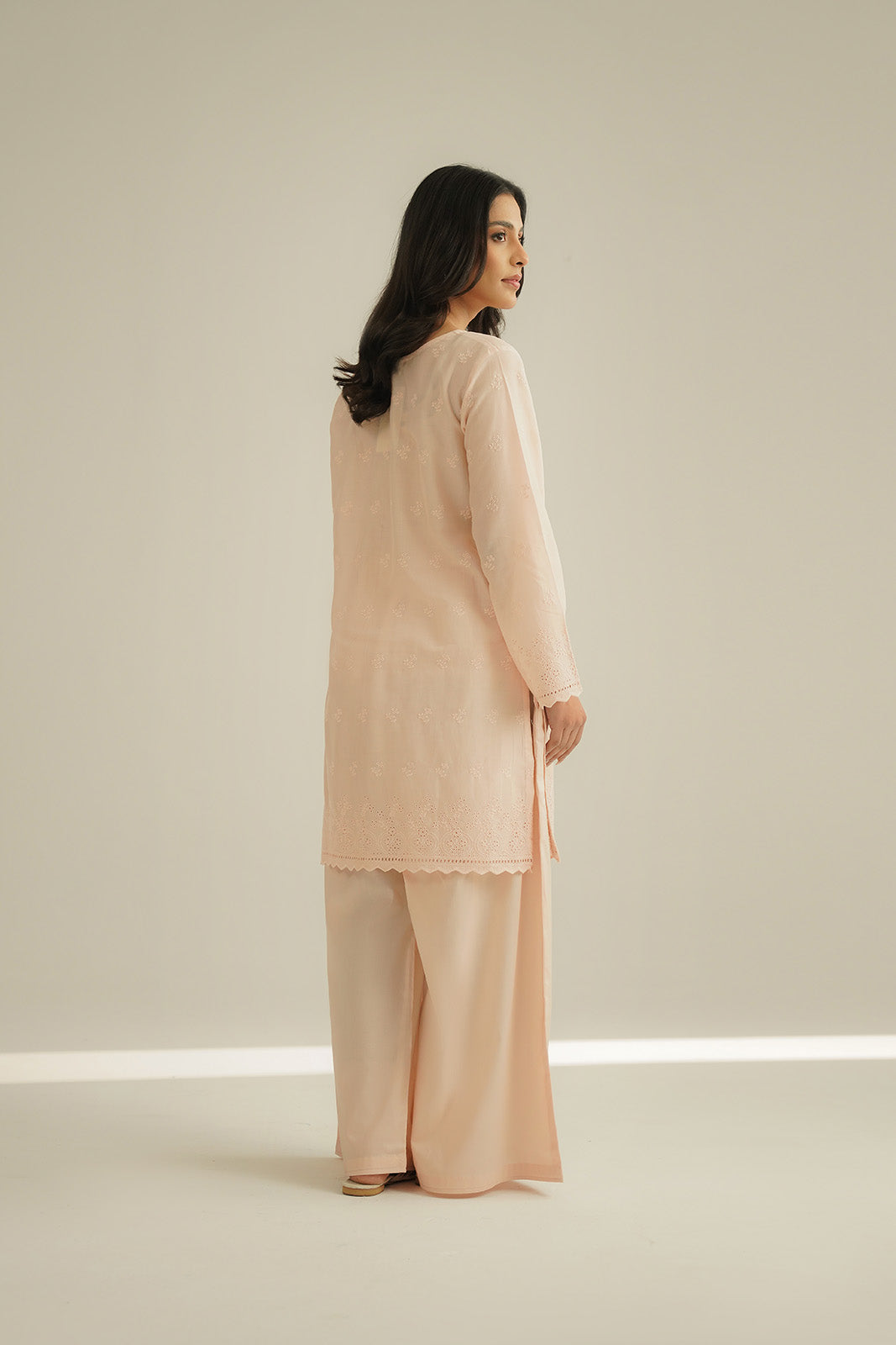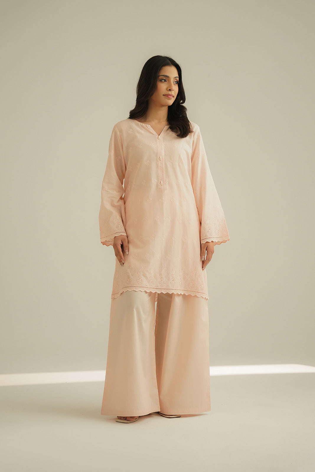Article Name: NIHAL ISColor: PeachFabric: LawnPieces: 2 Piece Shirt/Bottom2 Piece Suit with self-embroidered shirt paired with plazzo.