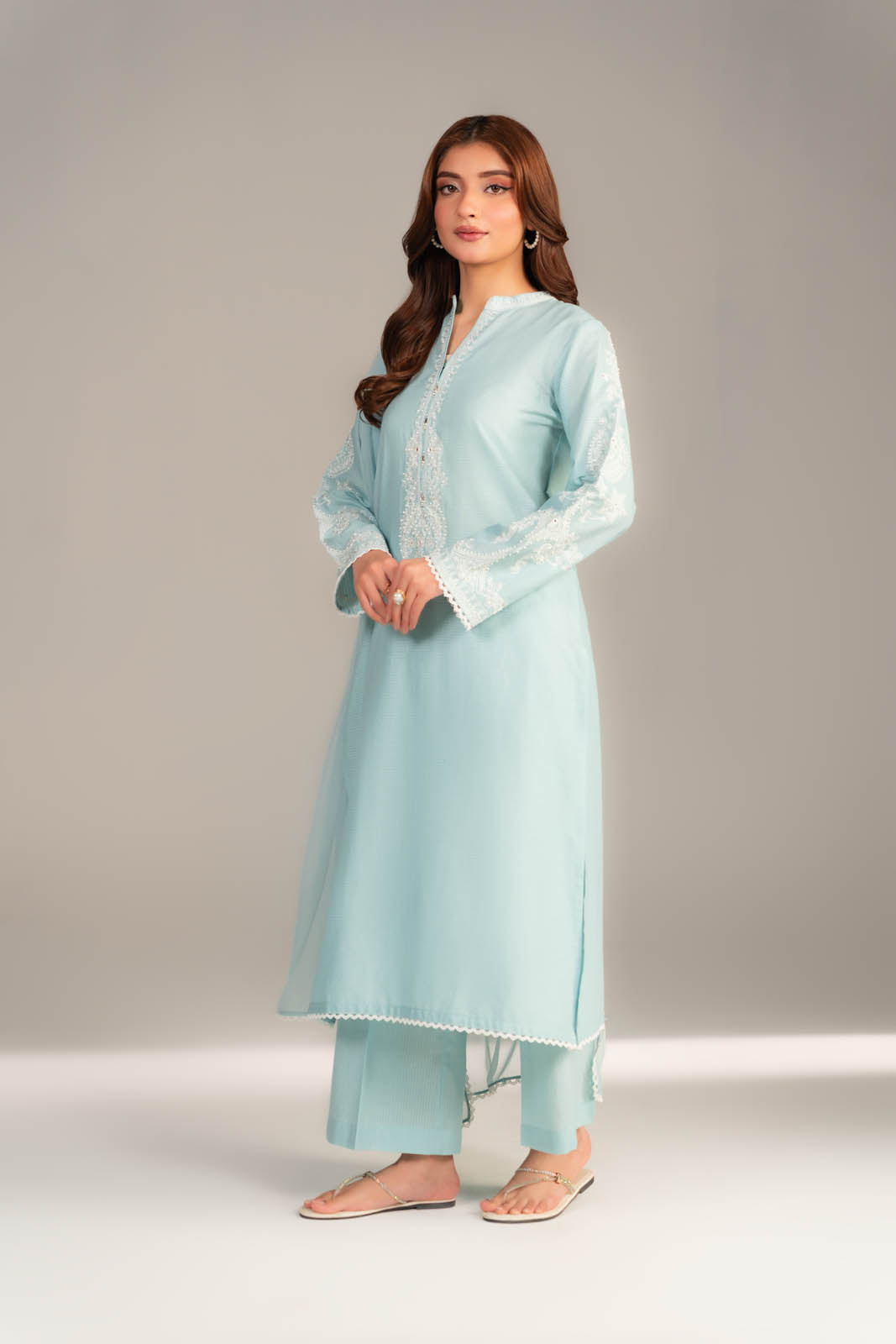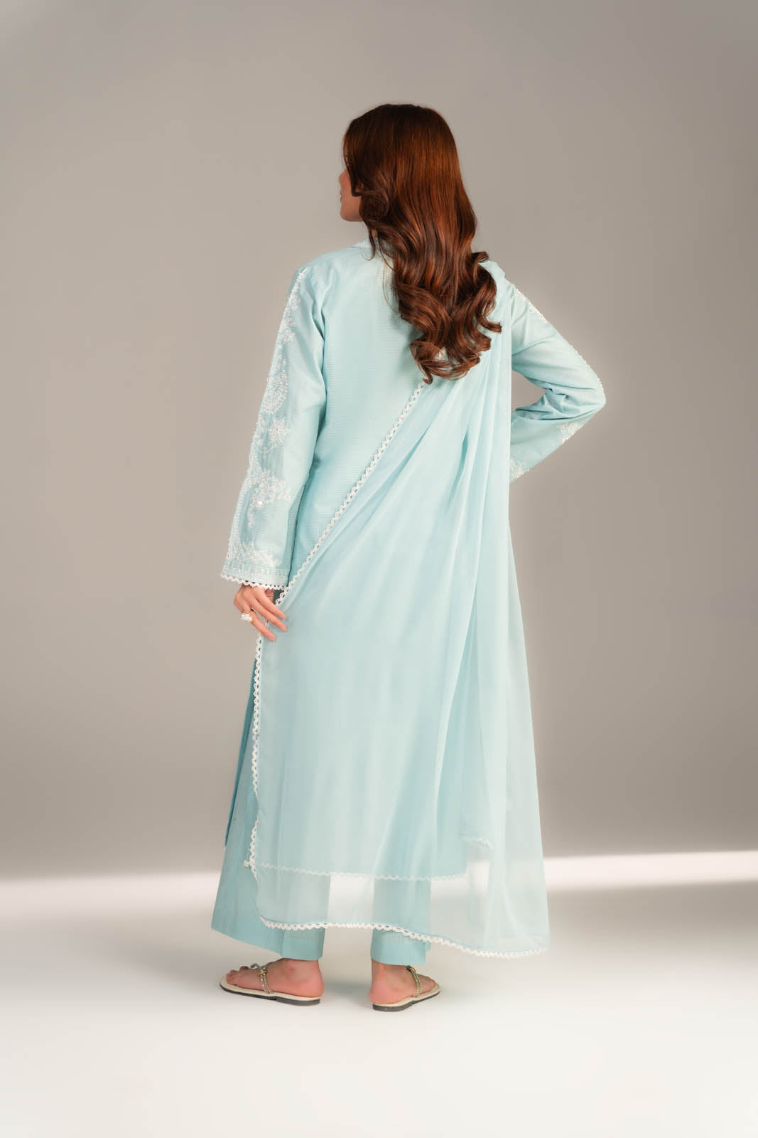Article Name: SKY BLOOM ISColor: Light BlueFabric: Cotton Rip StopPieces: 3 Piece Suit3 Piece Suit embroidered neckline & sleeves detailed with beads & mirror embellishment paired with chiffon dupatta & cambric culottes.