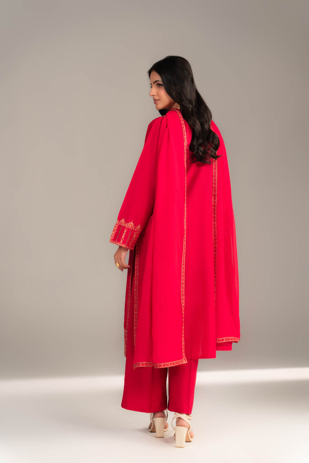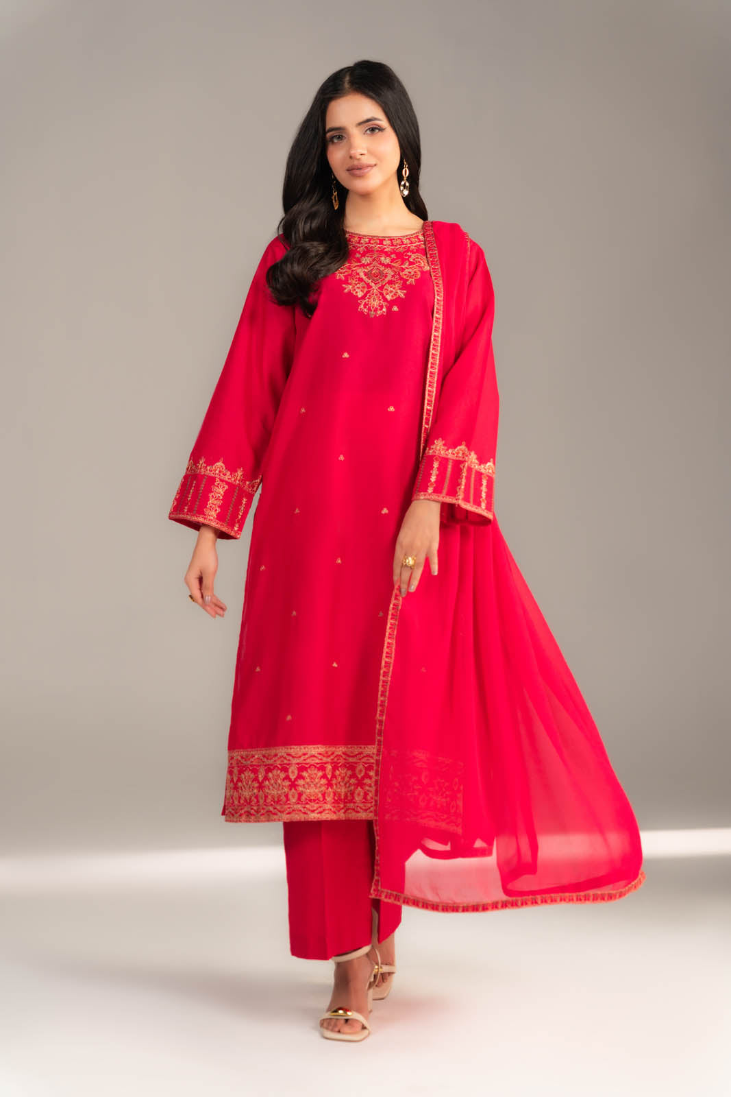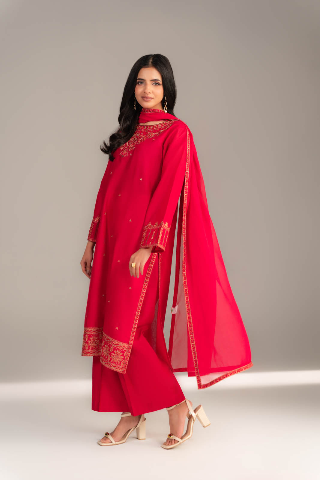 Article Name: DAHLIA MColor: PinkFabric: LawnPieces: 3 Piece SuitEmbroidered pink three-piece suit detailing embroidered neckline, hem & sleeves shirt paired with embroidered chiffon dupatta & plain culottes.