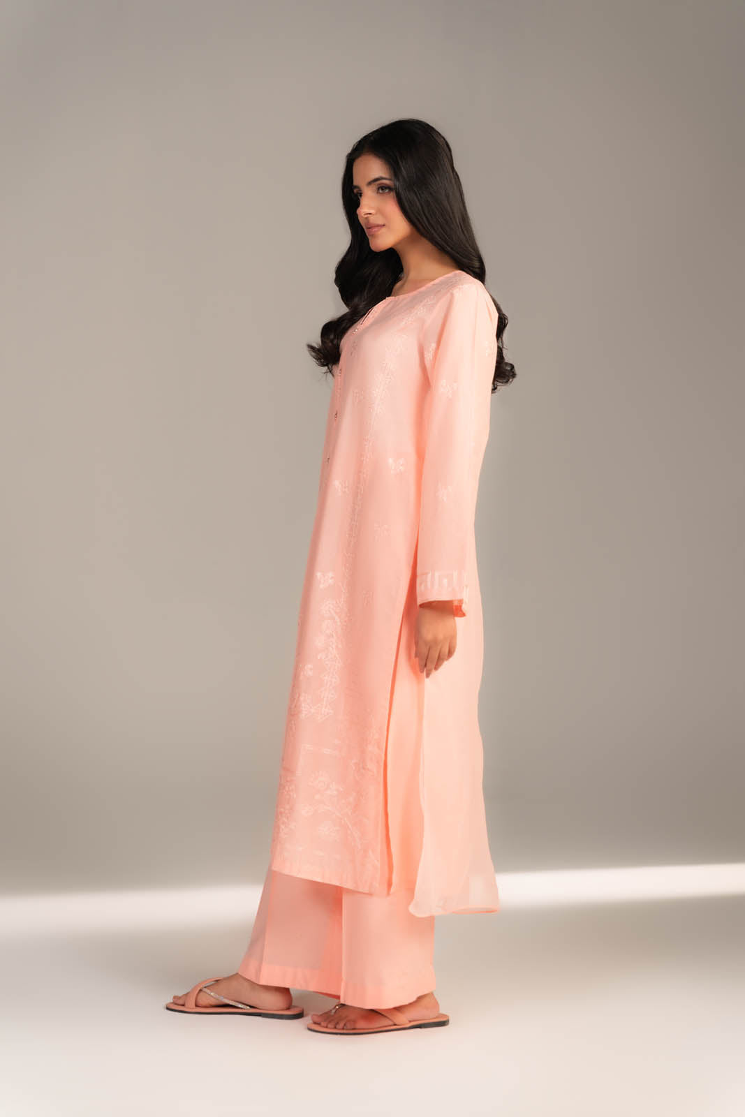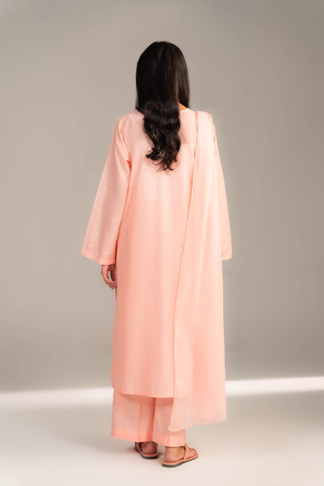 Article Name: ASMIRA QColor: Peachy PinkFabric: LawnPieces: 3 Piece SuitFully embroidered lawn shirt with tassels detailed on neckline paired with cambric culottes and chiffon dupatta.