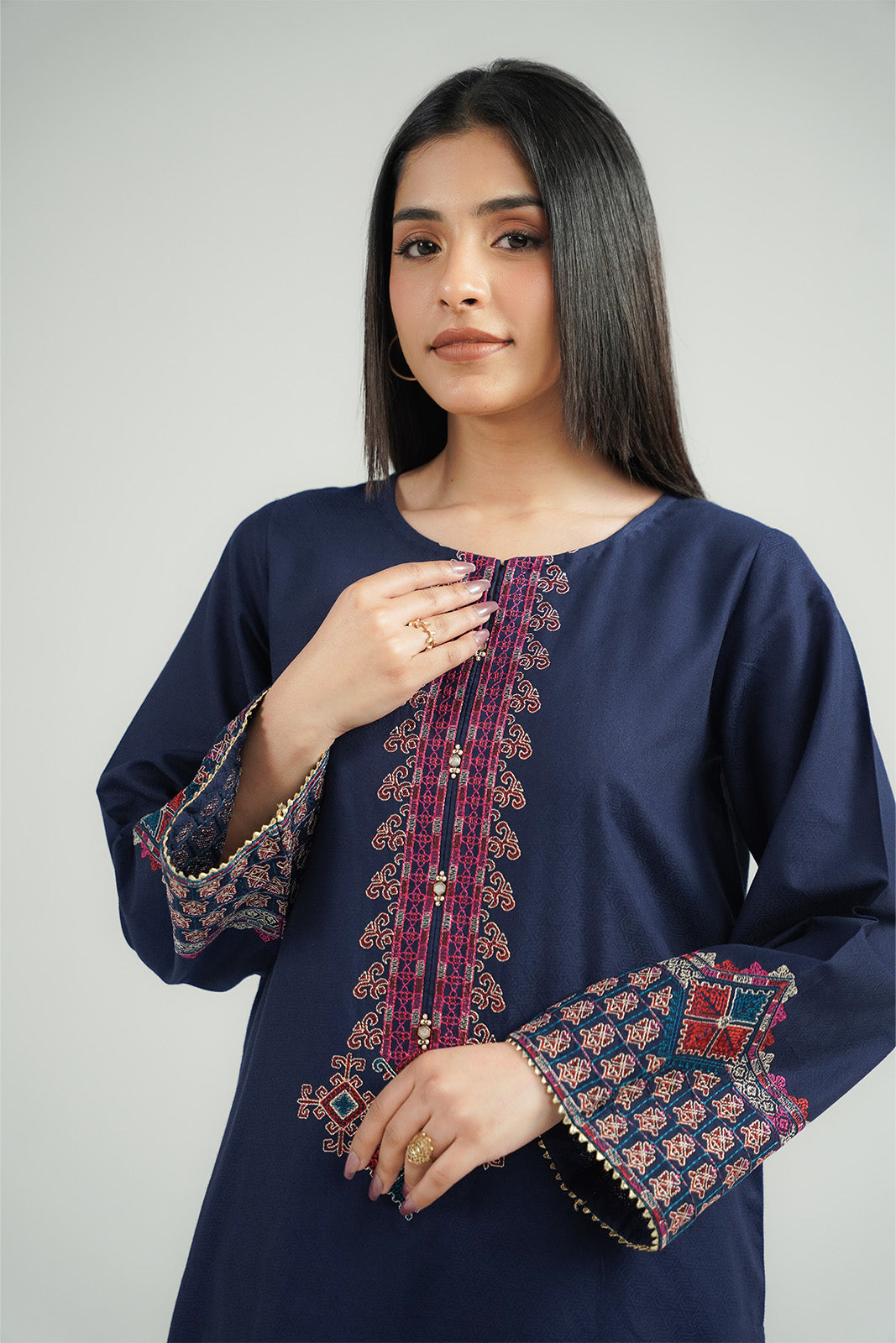 DetailsArticle Name: ASHFIColor: Navy BlueFabric: Self Cotton JacquardPieces: 2 Piece Shirt/BottomNavy blue self-jacquard embroidered 2-piece suit detailed with embroidery on shirt & paired with culottes.