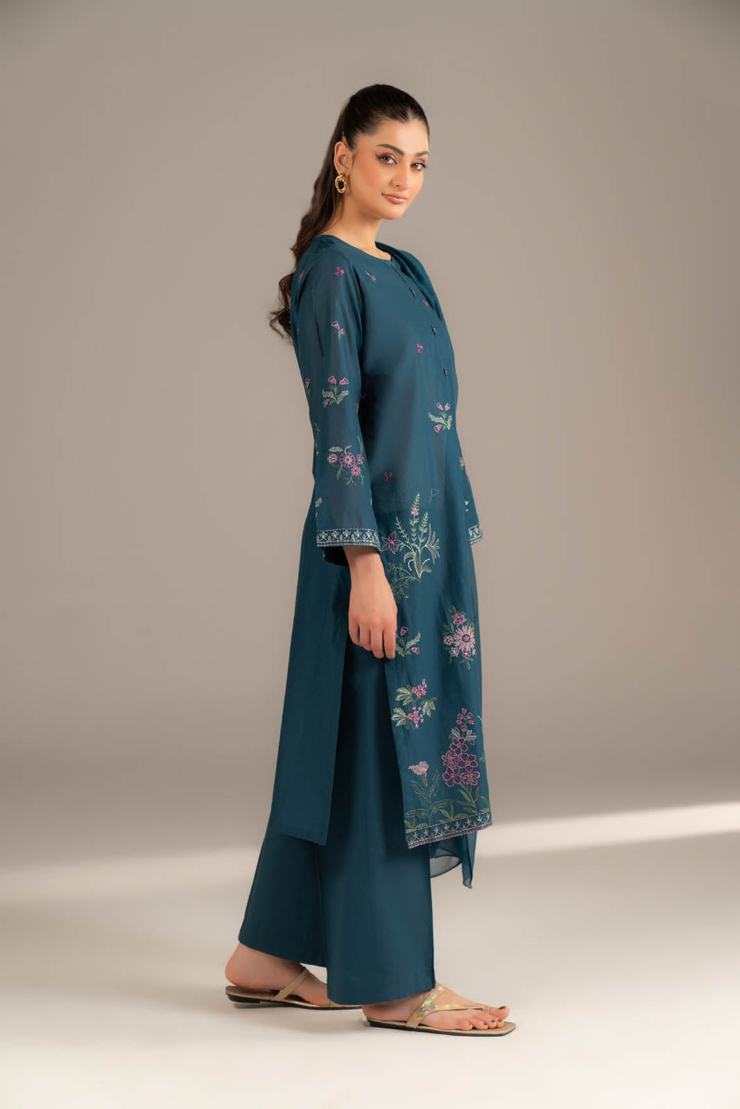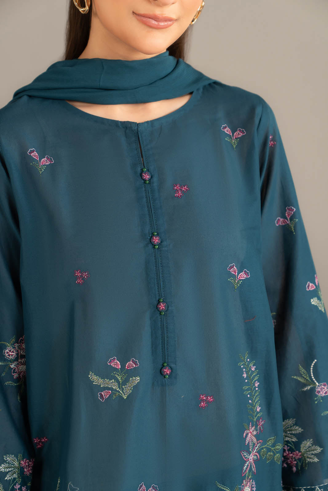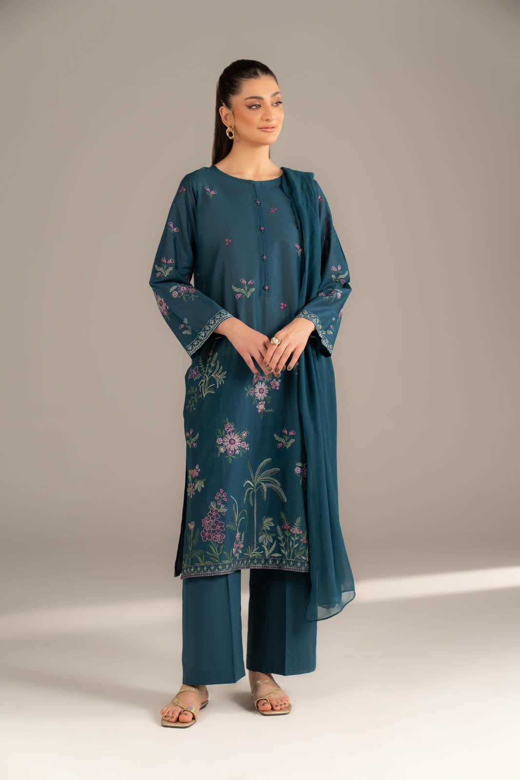 Article Name: IRIS BLOOM MColor: Teal BlueFabric: LawnPieces: 3 Piece SuitTeal blue lawn embroidered shirt paired with cambric culottes and chiffon dupatta.