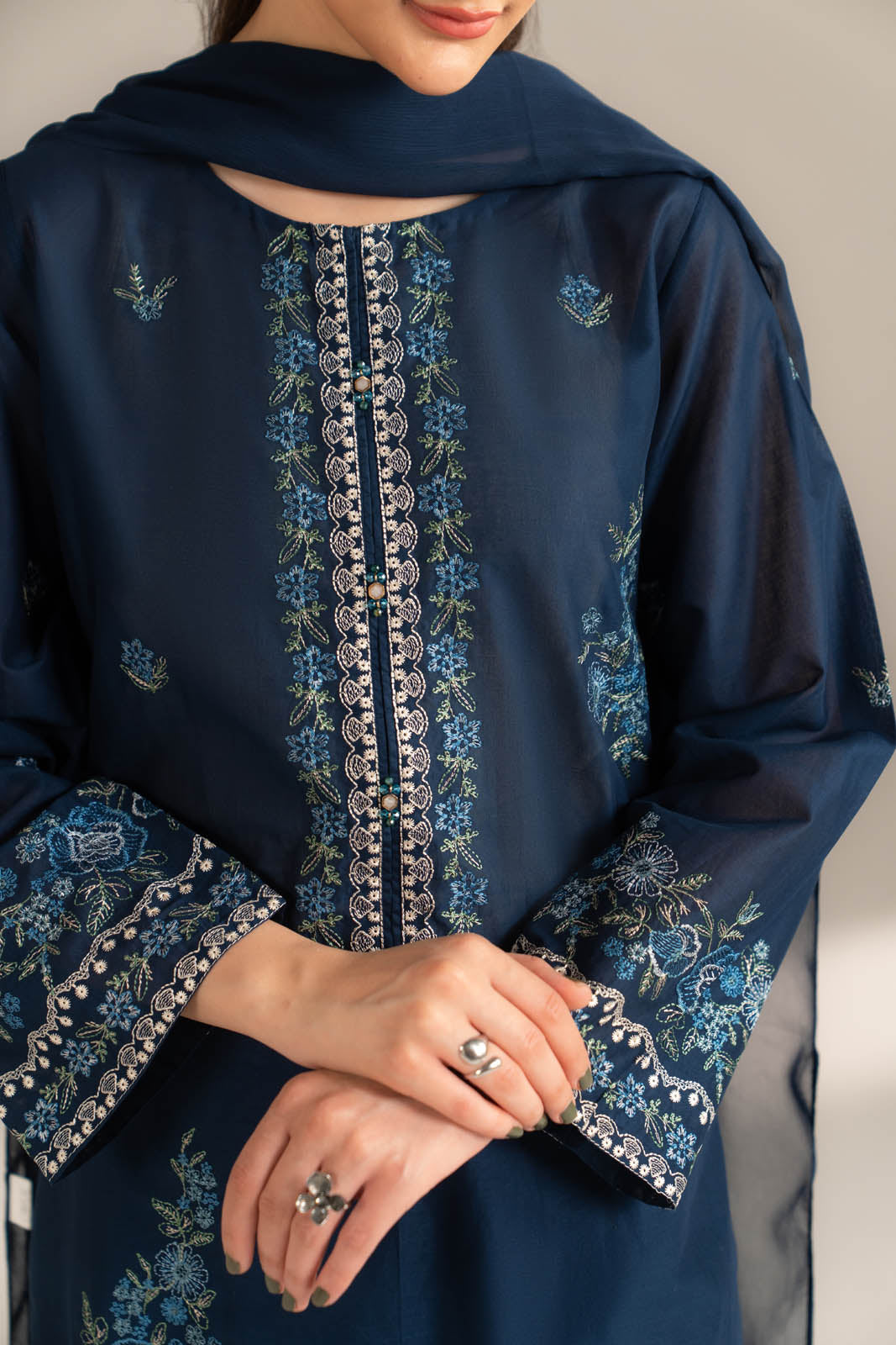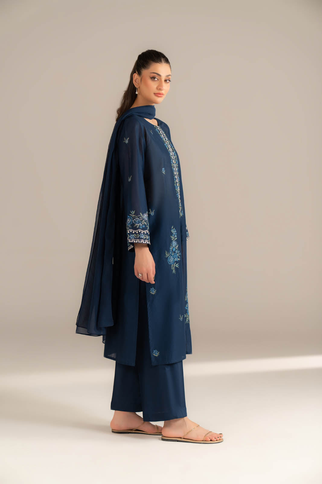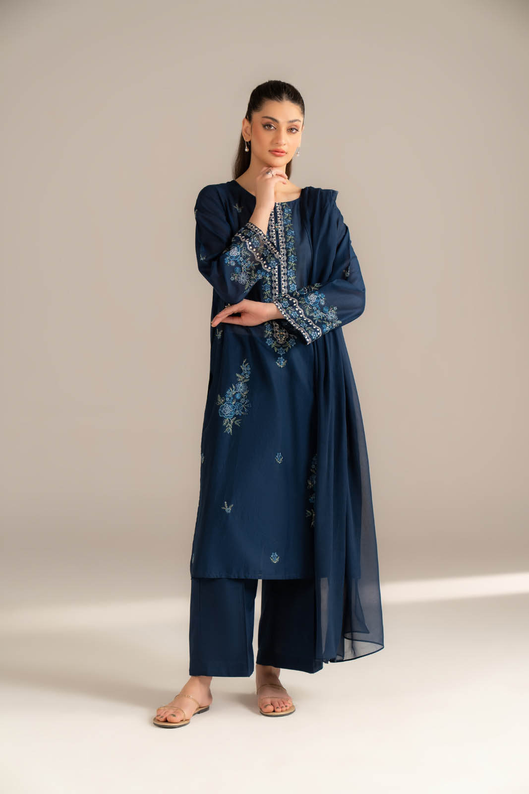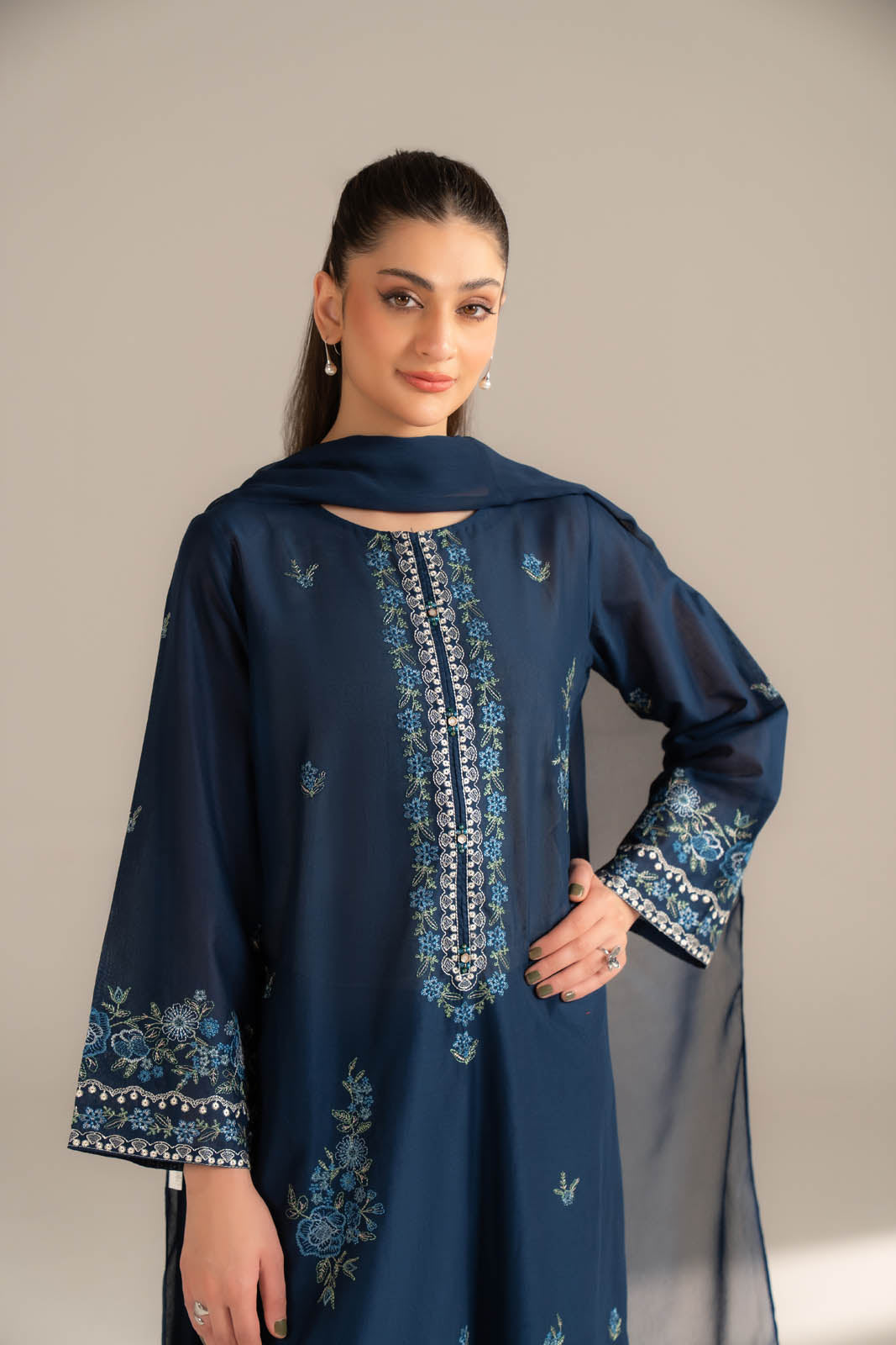 Article Name: ARIYA SColor: Navy BlueFabric: LawnPieces: 3 Piece SuitBlue embroidered shirt paired with cambric culottes and chiffon dupatta.
