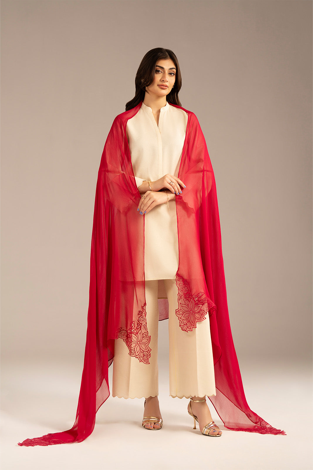 DetailsArticle Name: SCARLET AURAColor: RedFabric: ChiffonPieces: 3 Piece SuitRed chiffon long shirt detailed with tilla and thread embroidery and embellishment paired with silk trouser and chiffon dupatta with tassel details and emb on pallu.