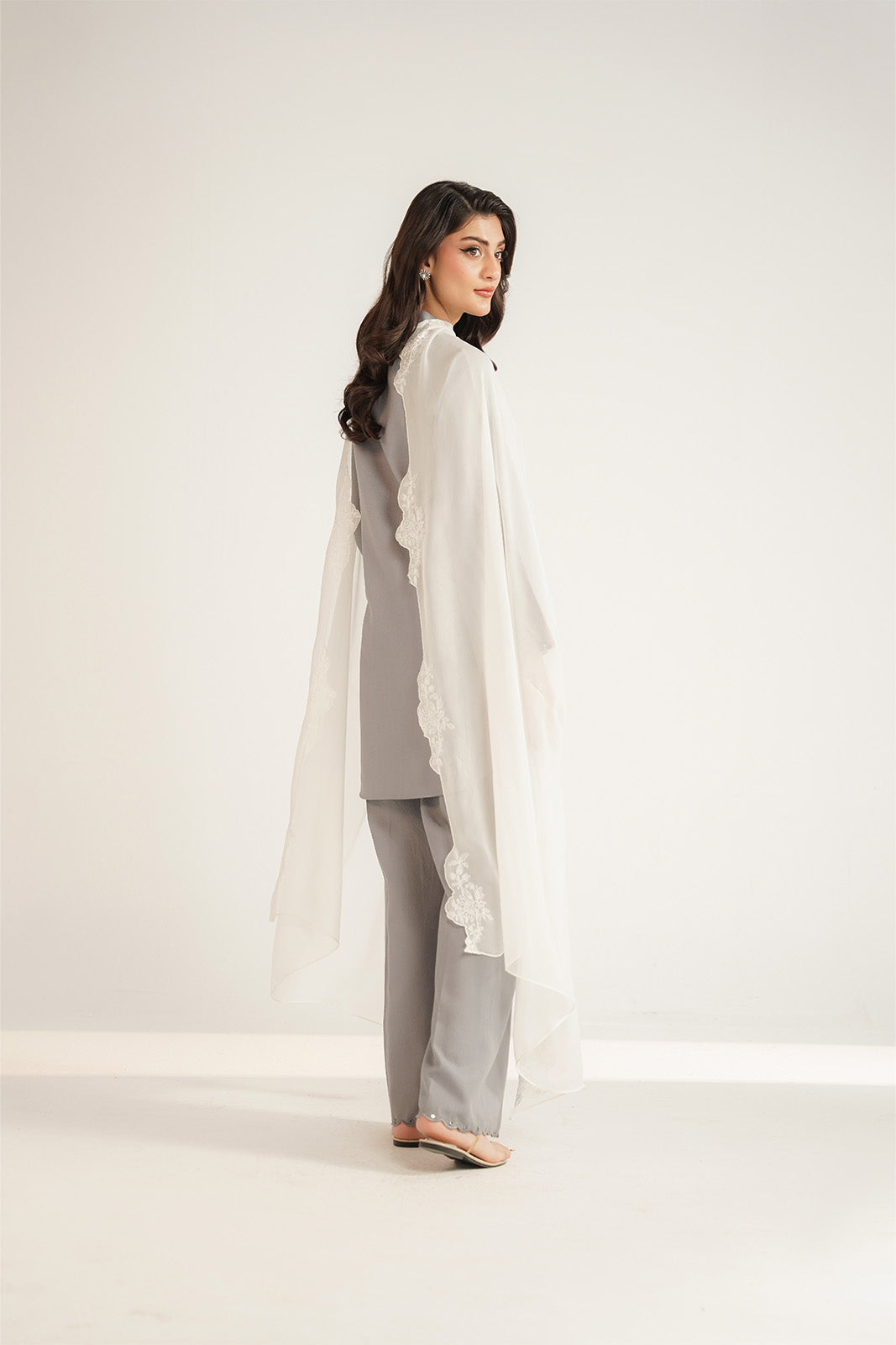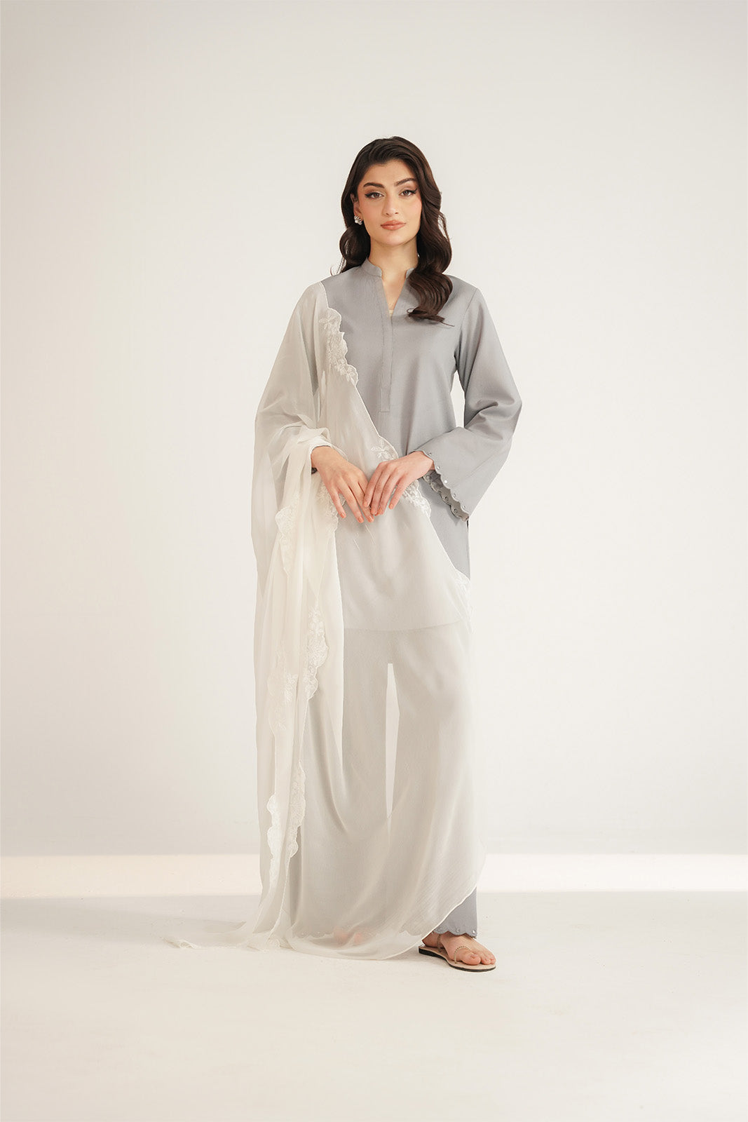 DetailsArticle Name: PATUNIAColor: VioletFabric: ChiffonPieces: 3 Piece SuitBeautiful pastel violet long straight silhouette, embroidered with thread & tilla on neckline & side slit intricate print added on dupatta paired up with silk culottes.
