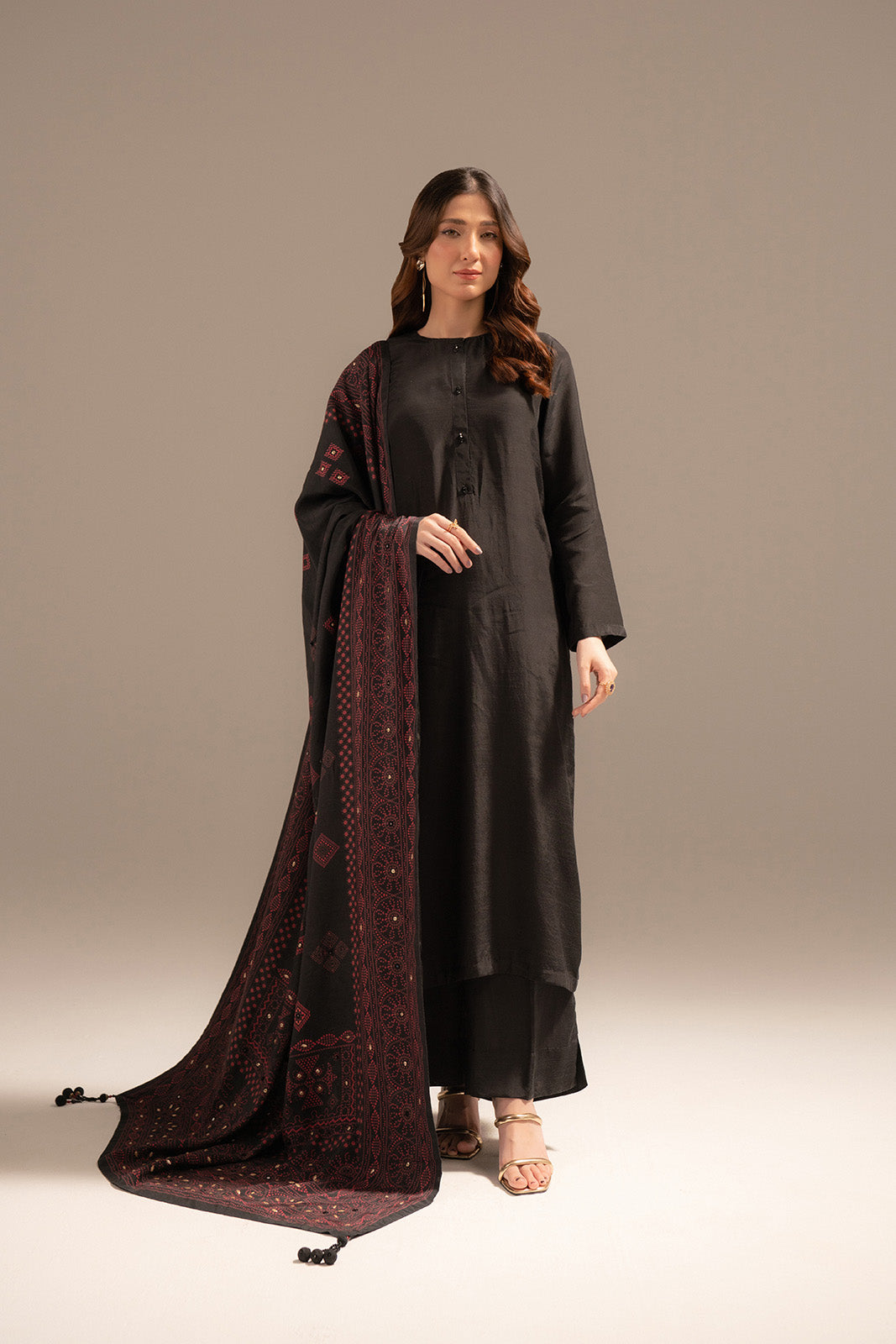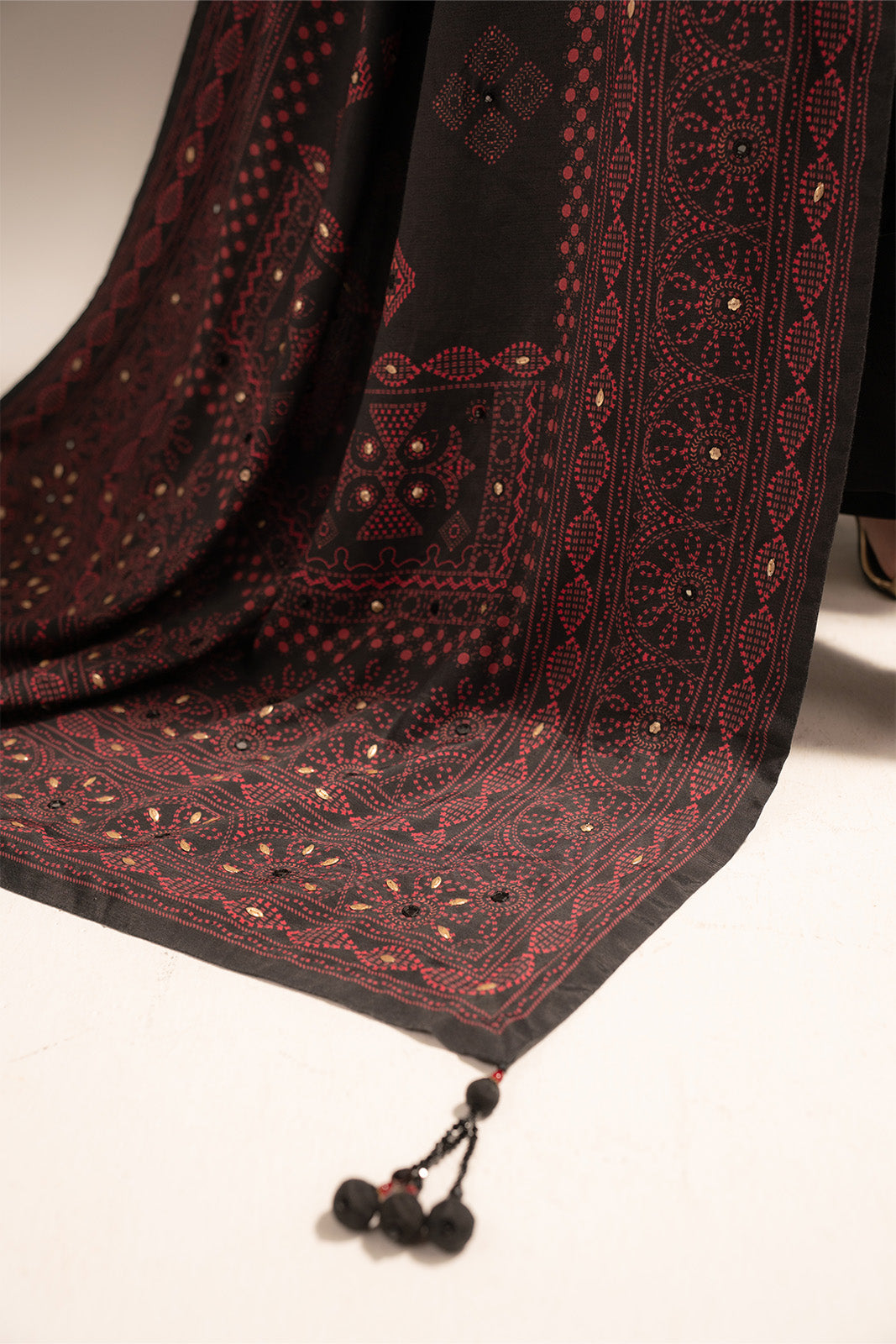Article Name: BLACK FALL Color: Black Fabric: Raw Silk Pieces: 1 Piece Shawl Featuring intricate print details with add on luxury adda work on our traditional look shawl perfect to elevate your outfit in festive seasons.