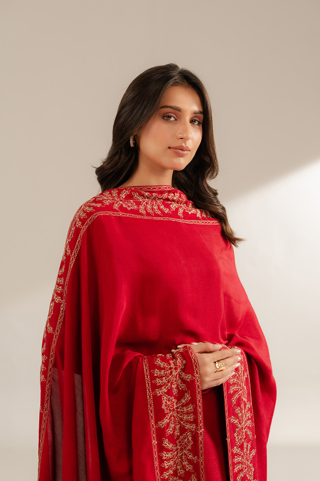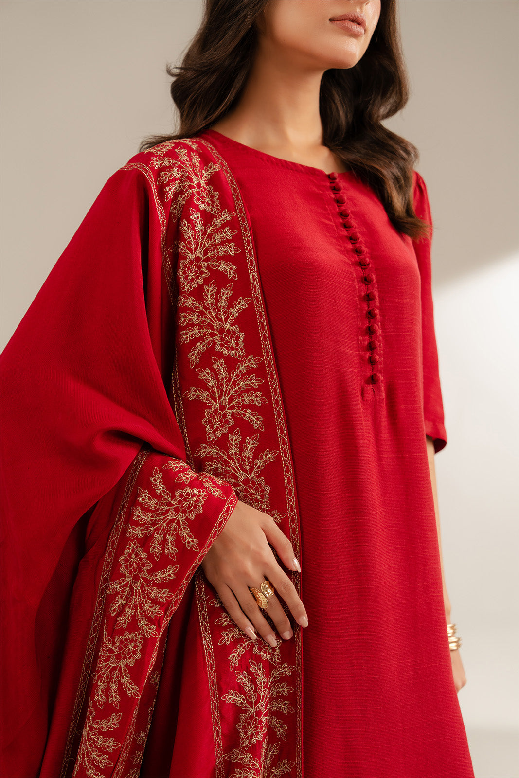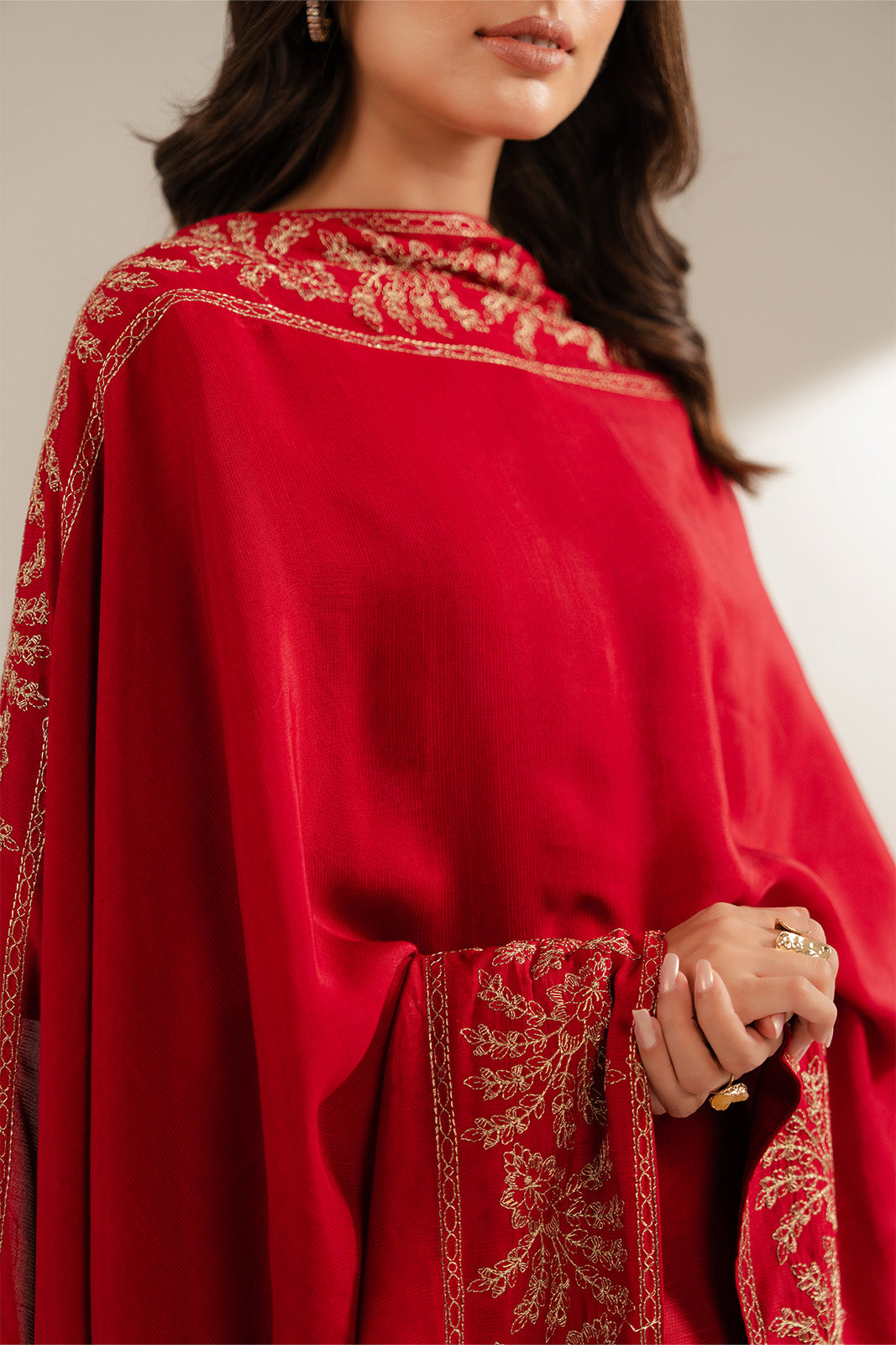 Article Name: BLUSHING RED SH Color: Red Fabric: Resham Cotton Pieces: 1 Piece Shawl A bold red shawl that adds warmth, passion and confidence to any look.