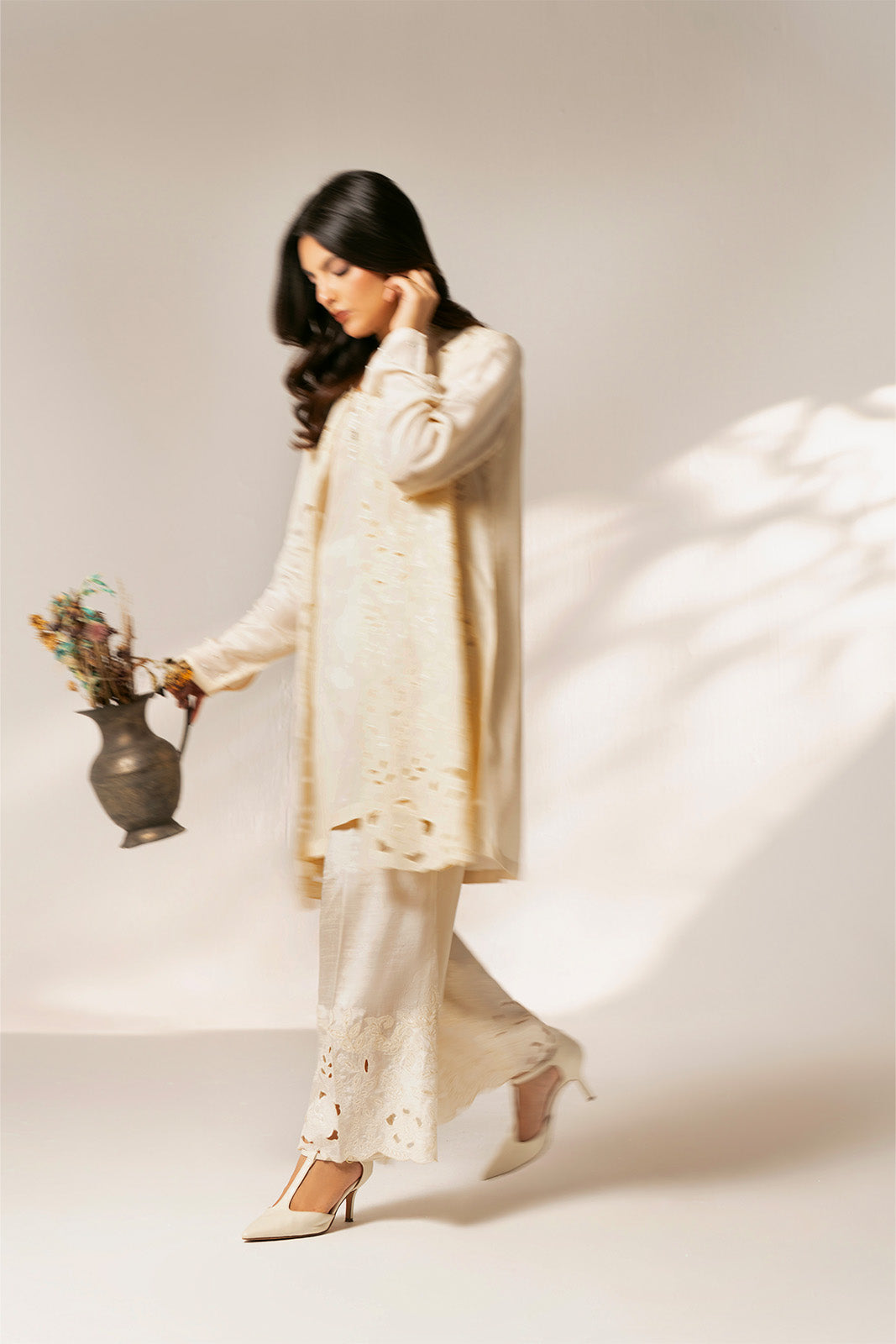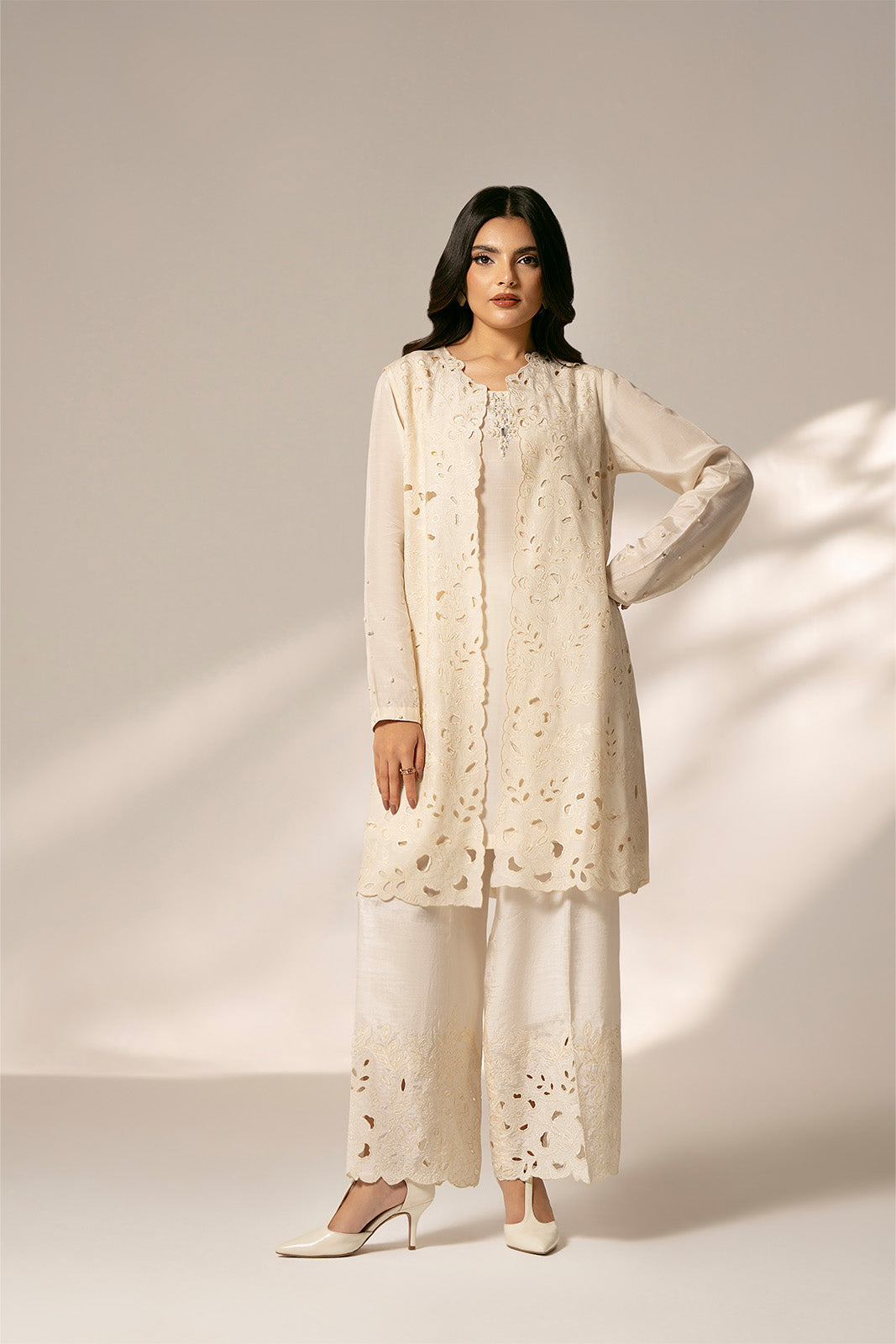 Article Name: WHITE PEARL B Color: OffWhite Fabric: Raw Silk Pieces: 2 Piece Jacket/Under Shirt The intricate cutwork and embellishment add a touch of modern trendy look for any occasion.