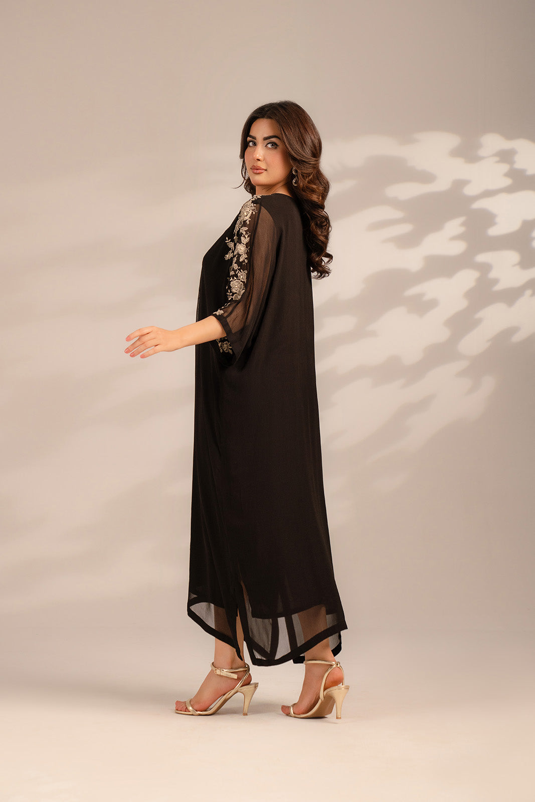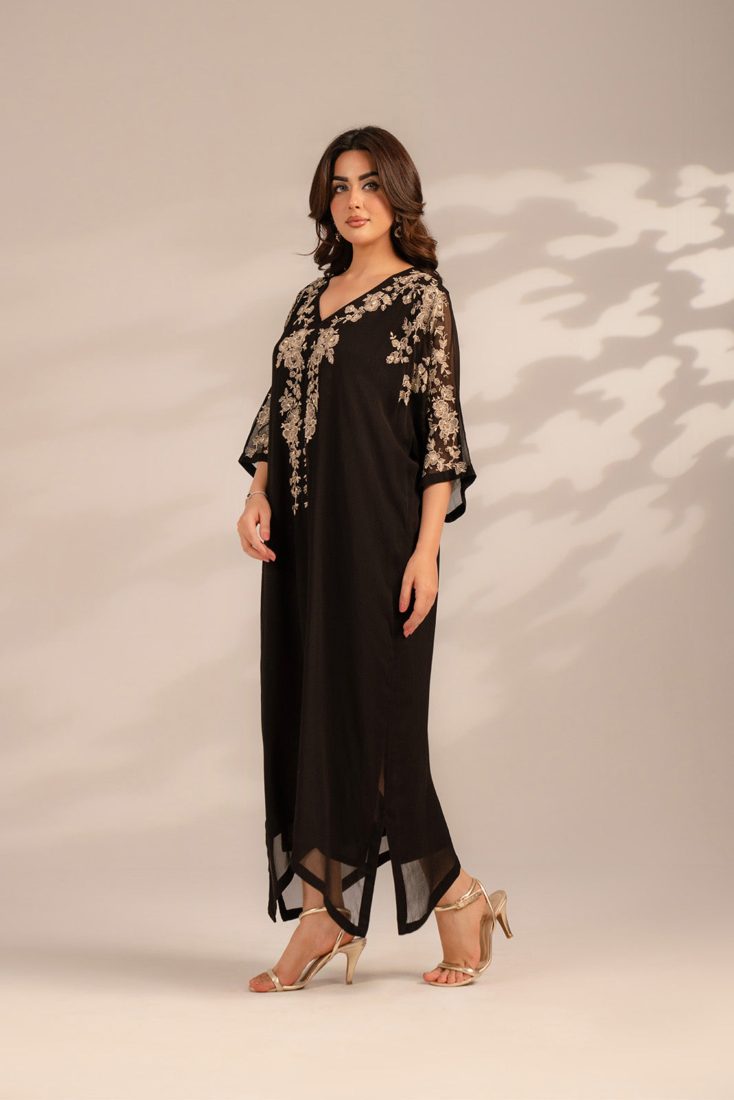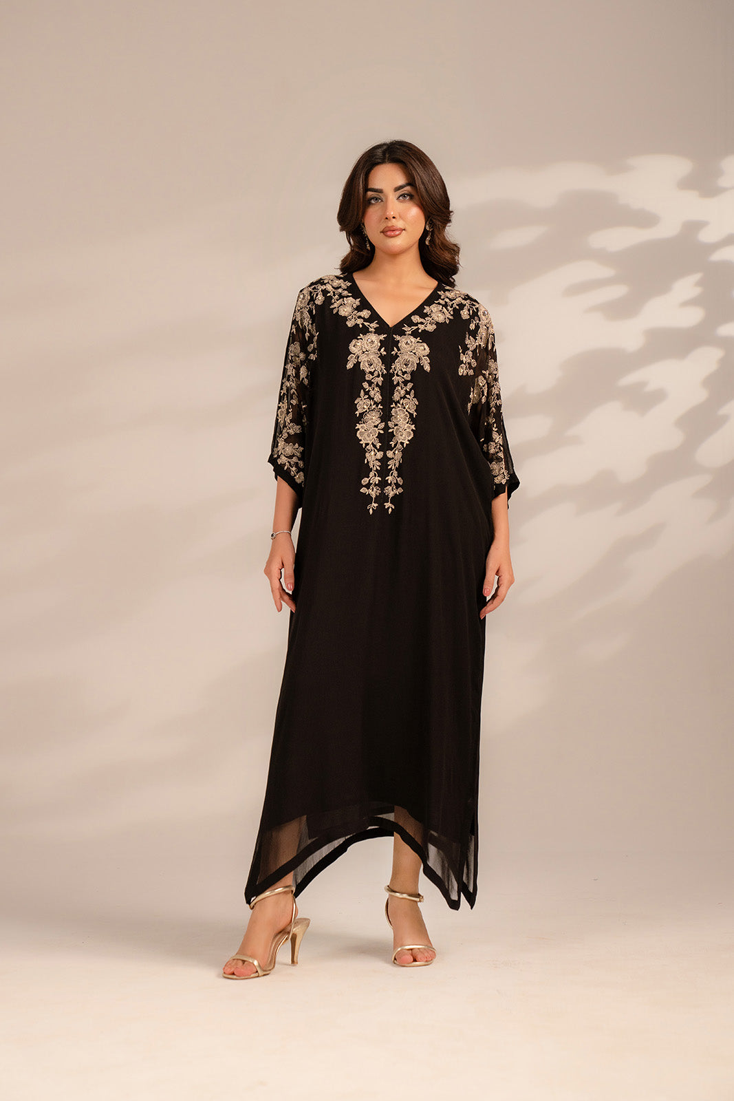 Article Name: BL KAFTAN Color: Black Fabric: Chiffon Pieces: 1 Piece Shirt Beautifully kaftan style black color with white embroidery and white pearls detail.