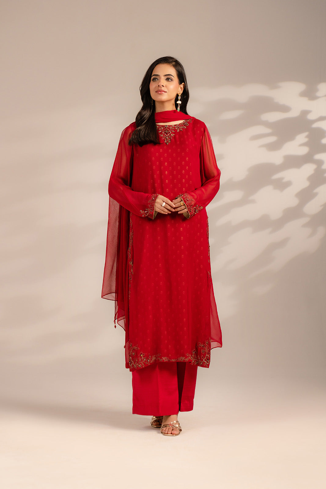 A rich ruby red, flowy silhouette layered with antique gold printed lining, glimmering with crystals, zardozi, and stones on the neckline, sleeves, hem, and sides adding depth and dimension to this elegant chiffon outfit.