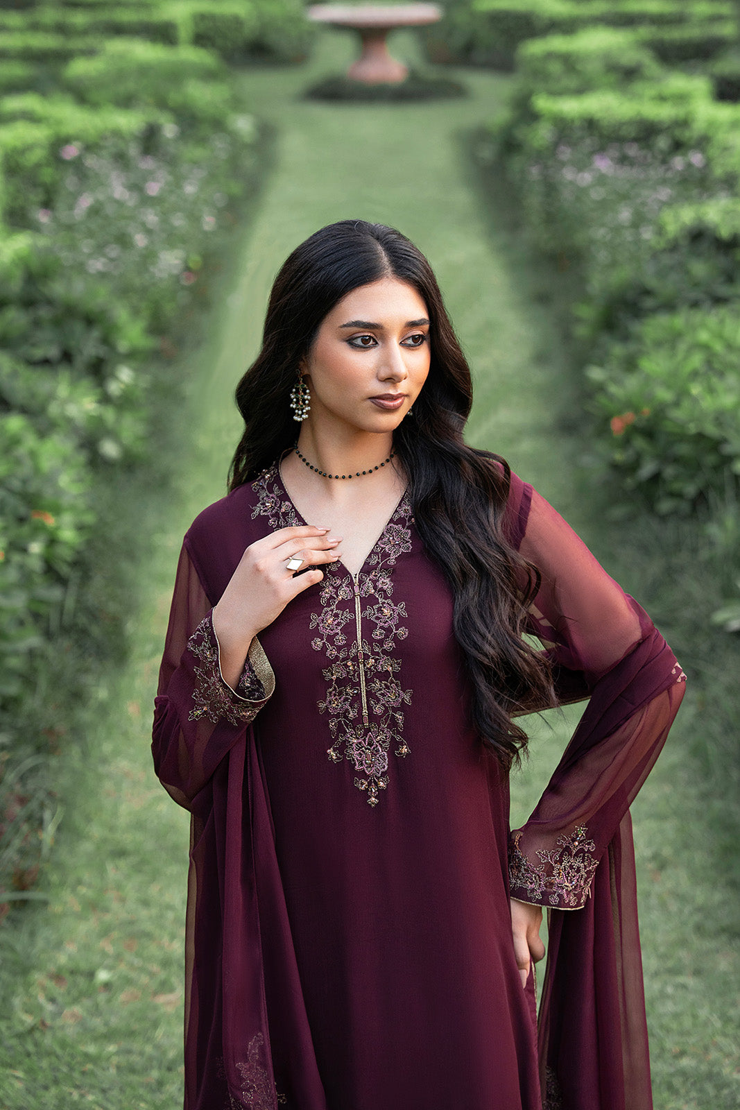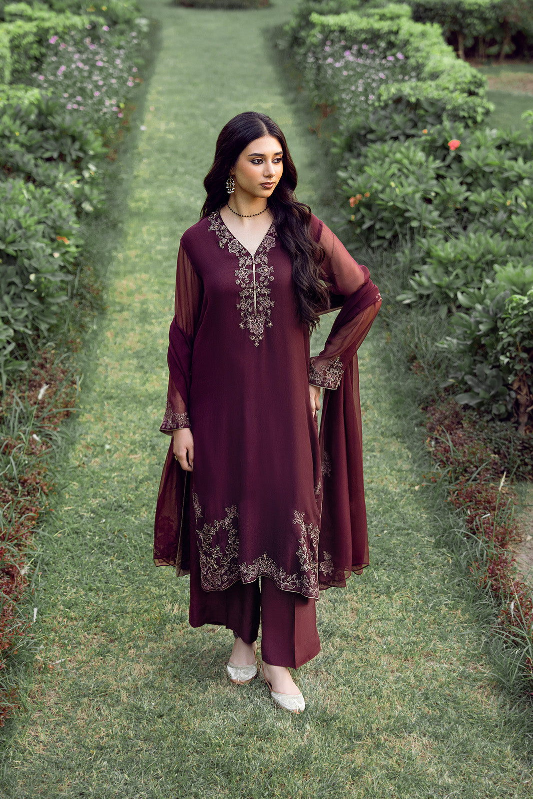 Set your style statement by wearing this color of the season cherry lacquer embellished with thread tilla& crystals paired up with embroidered dupatta & silk pants.