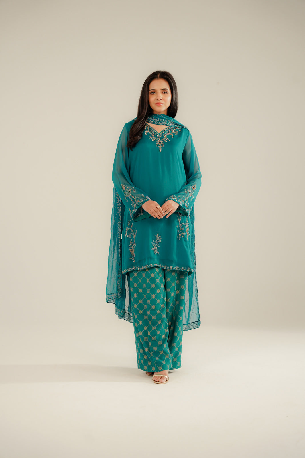 Article Name: FEROZA B B Color: Ferozi Fabric: Chiffon Pieces: 3 Piece Suit Add a touch of luxury to your festive look with our trendy yet sophisticated outfit.