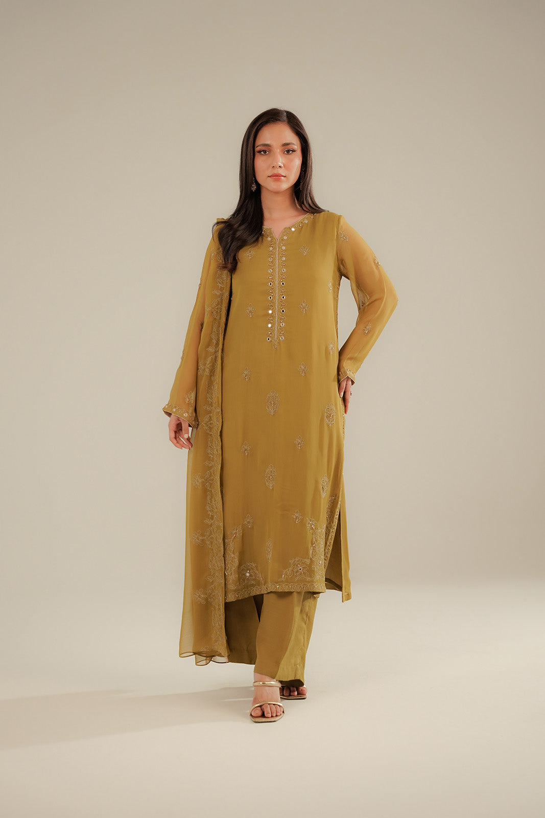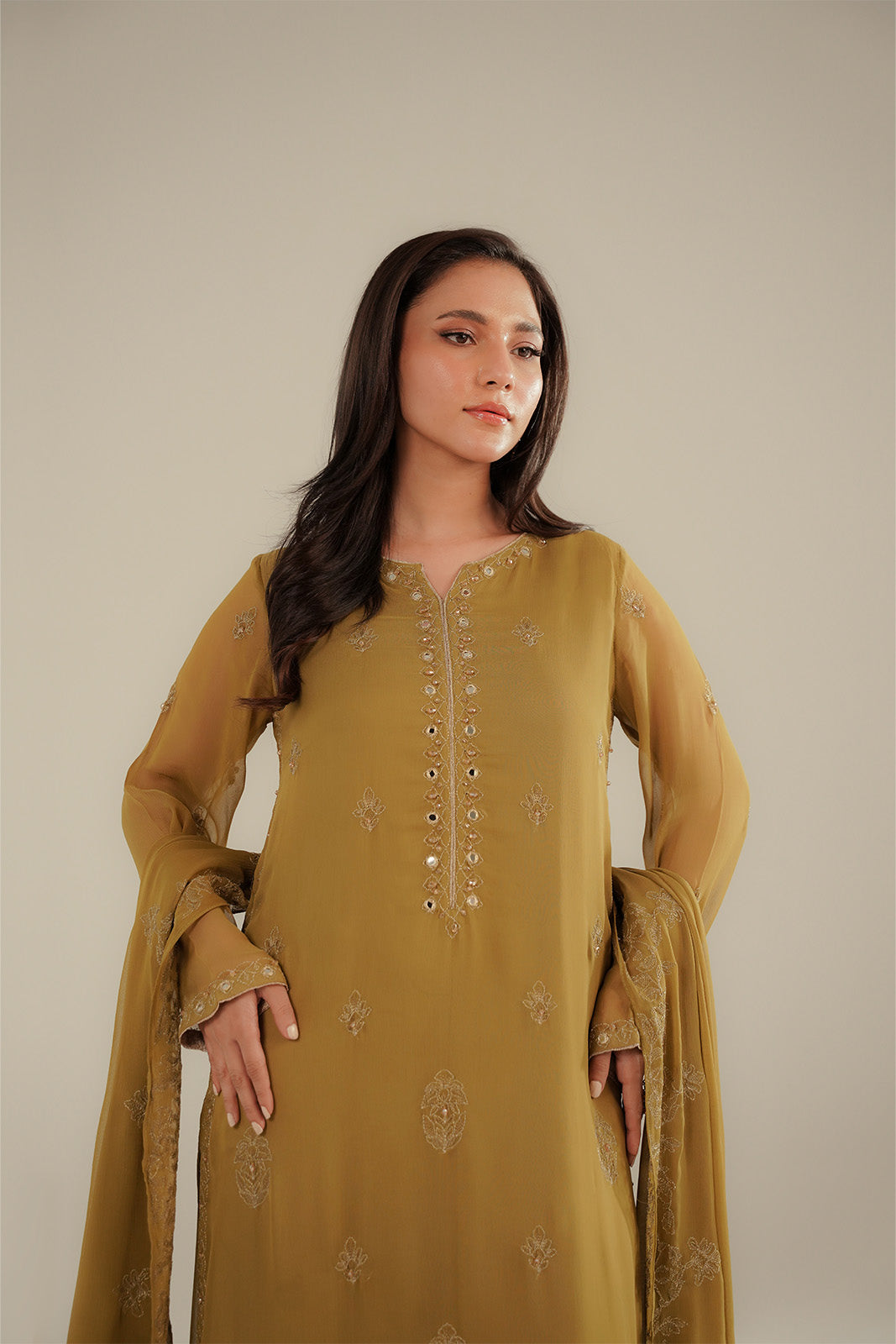 Article Name: PERIDOT S Color: Olive Green Fabric: Chiffon Pieces: 3 Piece Suit Elevate your style with this olive-green chiffon outfit detailed thread & tillas embroidery hand crafted with Mukesh and crystal work paired with silk culottes.