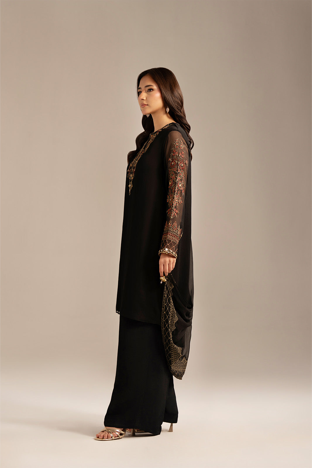 Article Name: RUSTIC BLACK Color: Black Fabric: Chiffon Pieces: 2 Piece Shirt/Dupatta Black chiffon shirt dupatta with tilla thread mirror semi-precious stones dull gold sequins on shirt dupatta finished with hand crafted tassel.
