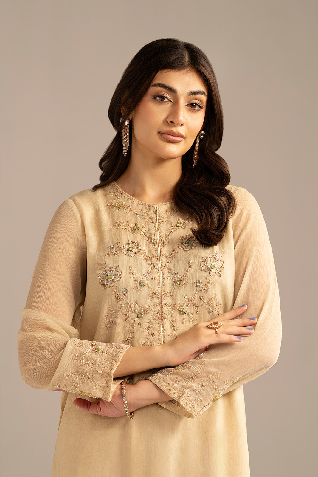 Article Name: IVORY WHISPER Color: Ivory Fabric: Chiffon Pieces: 1 Piece Shirt A graceful ivory dress that radiates sophistication and purity, ideal for a refined and timeless look.