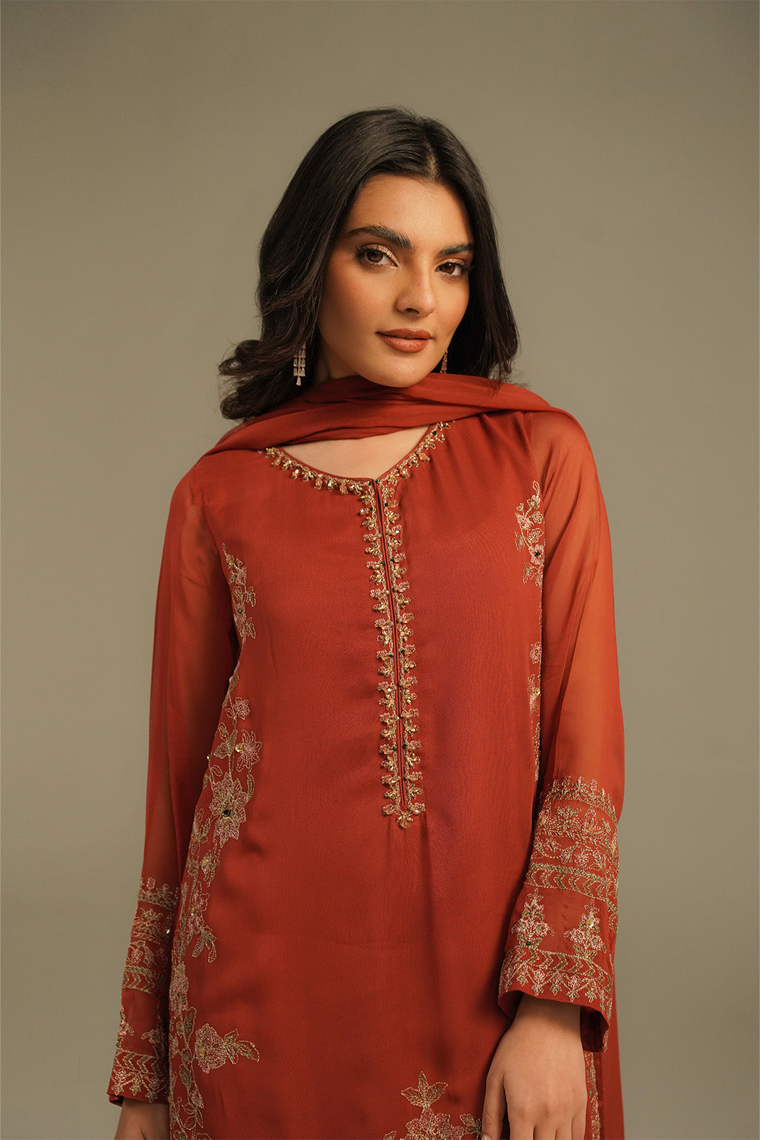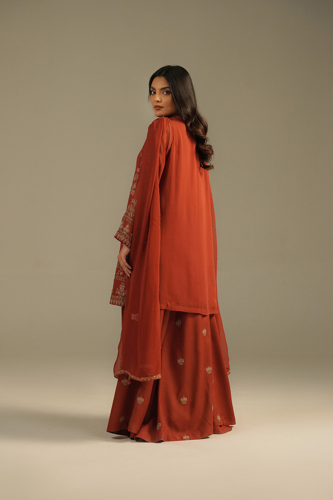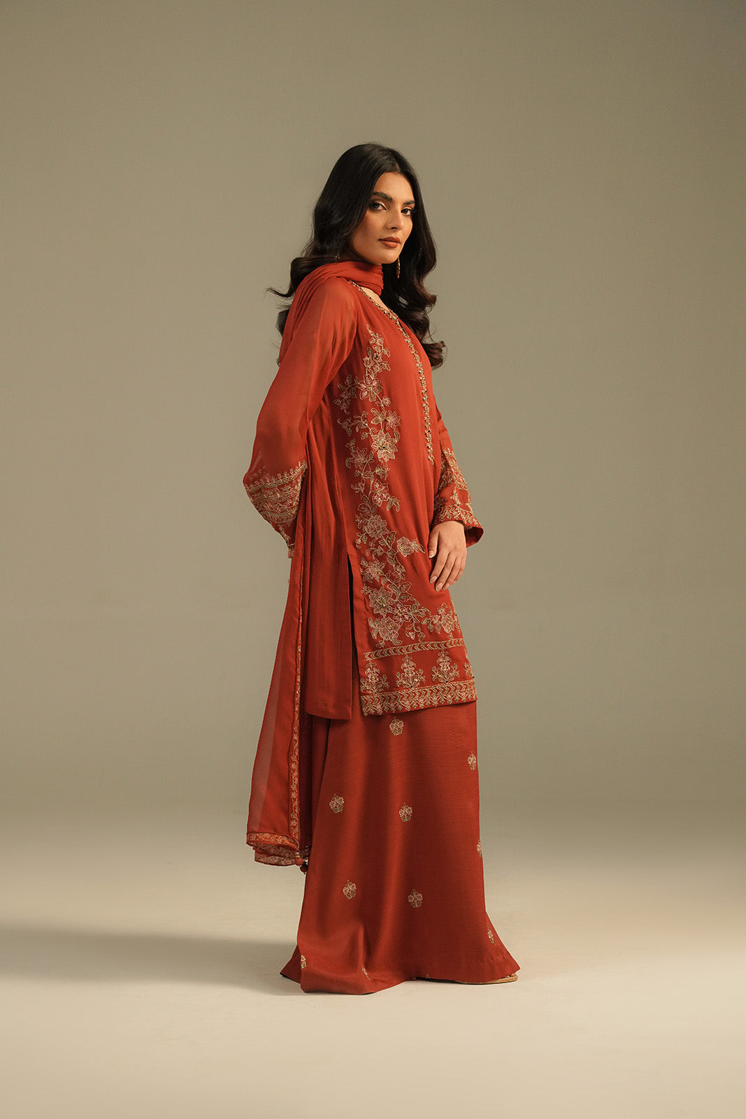 Article Name: TERRA COTTA B Color: Rust Fabric: Chiffon Pieces: 3 Piece Suit A luxury Pret ensemble styled with an elegantly embroidered sharara bringing a touch of glamour & trendy look at any event.